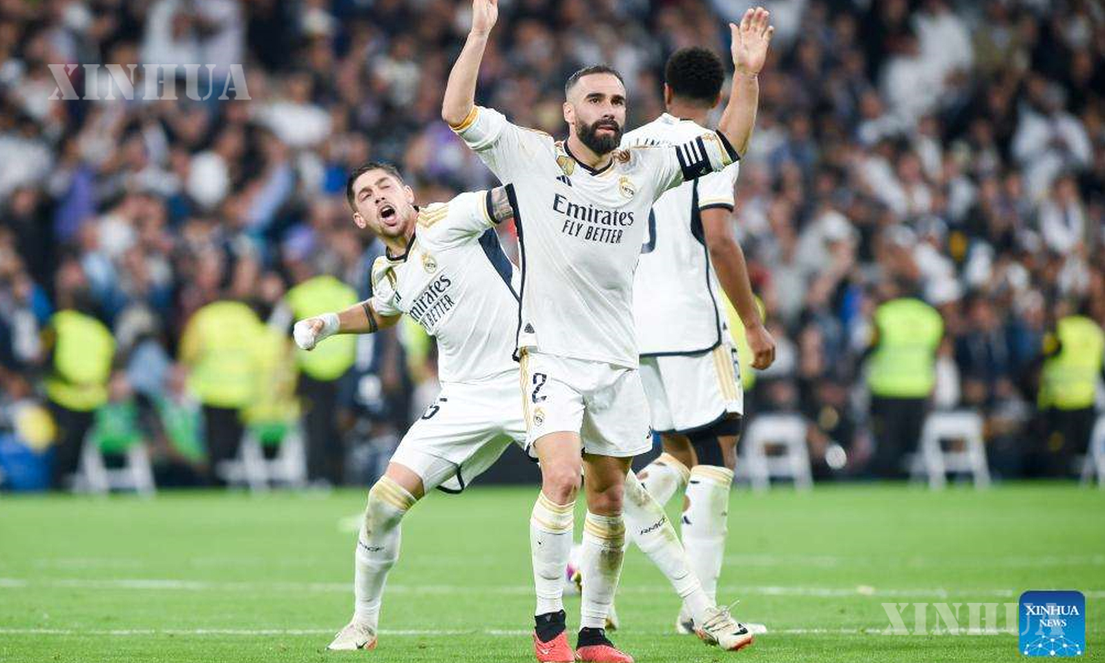Federico Valverde (L) and Dani Carvajal (C) of Real Madrid celebrate a goal during a Spanish La Liga football match between Real Madrid and Real Sociedad in Madrid, Spain, Sept. 17, 2023. (Photo by Gustavo Valiente/Xinhua)