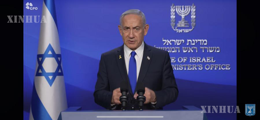 This video screenshot shows Israeli Prime Minister Benjamin Netanyahu delivering a video address on June 13, 2025. (Xinhua)