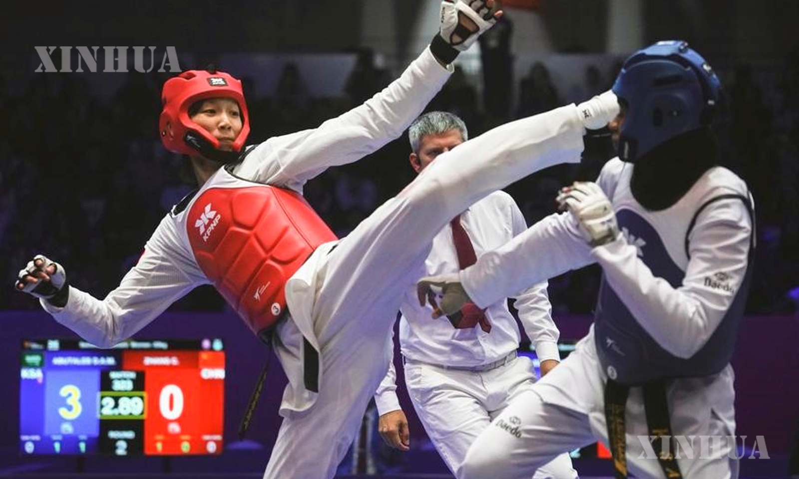 In the women’s 53kg semifinal, Zhang, this year’s national champion, lost 2-0 to Saudi Arabia’s Dunya Ali M. Abutaleb. Zhang conceded the first round 2-0 after her opponent scored with a mid-level kick.