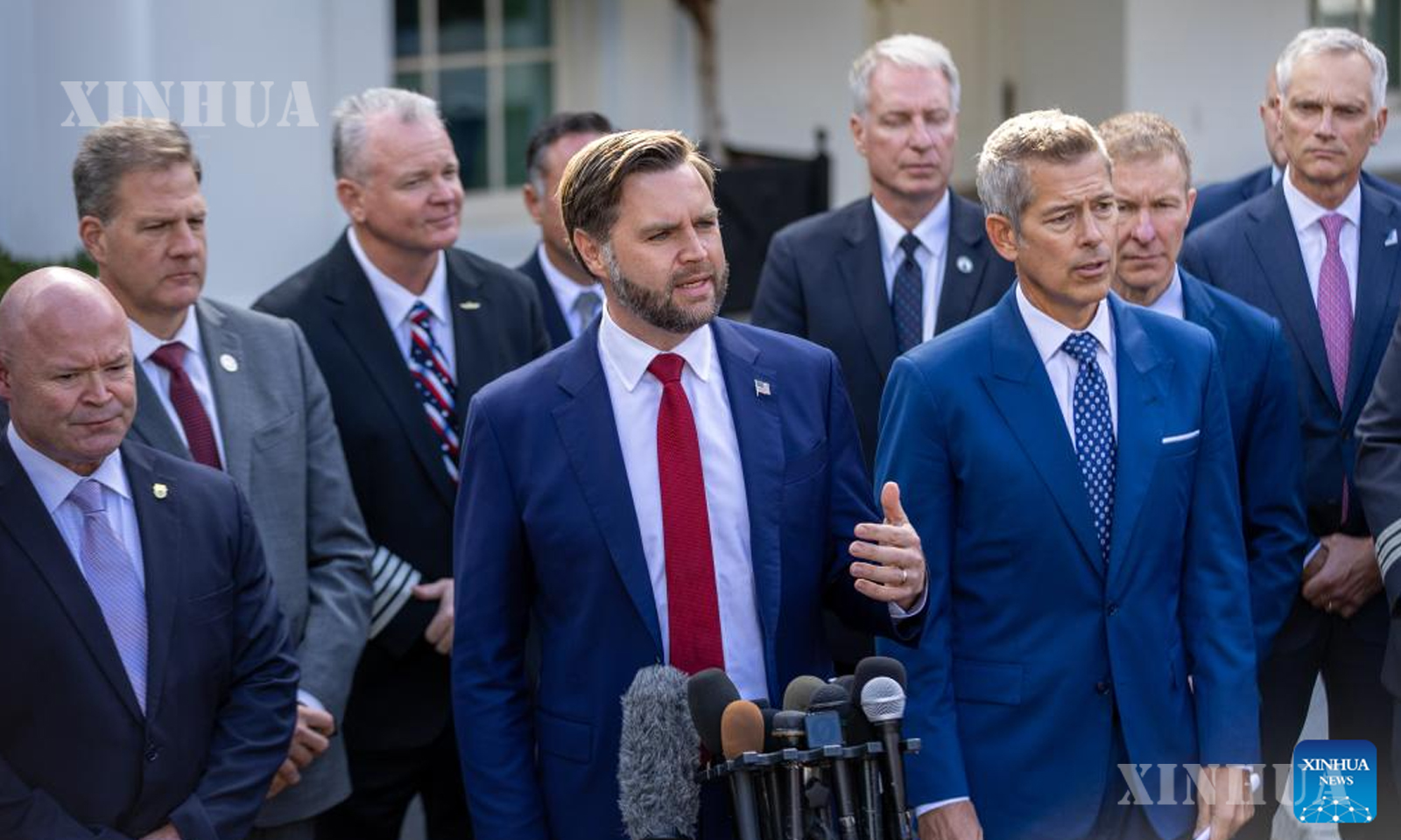 U.S. Vice President JD Vance (C, front) answers a reporter’s question at the White House in Washington, D. C., the United States, Oct. 30, 2025. (Xinhua/Hu Yousong)