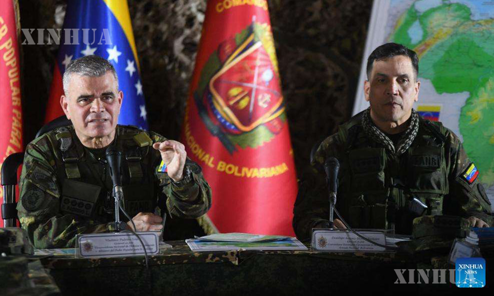 Venezuelan Defense Minister Vladimir Padrino Lopez (L) speaks during a press conference held in Caracas, Venezuela, Aug. 31, 2025.
