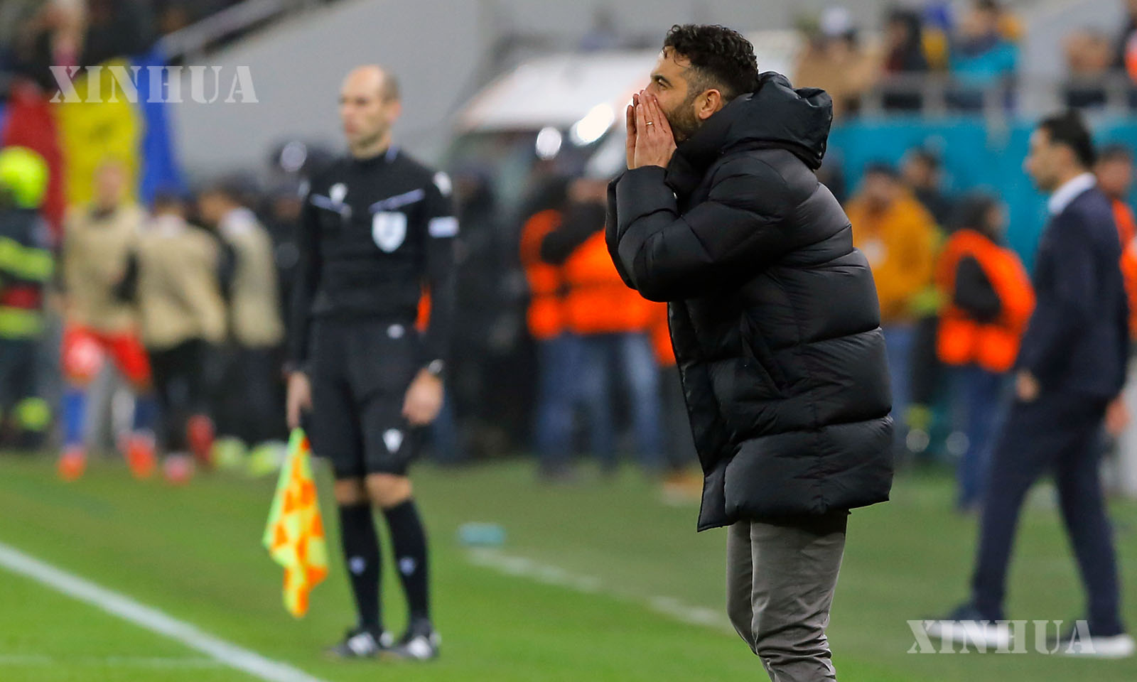 Manchester United’s coach Ruben Amorim (front) gestures during the UEFA Europa League football match between Manchester United and FCSB in Bucharest, Romania, Jan. 30, 2025. (Photo by Cristian Cristel/Xinhua)