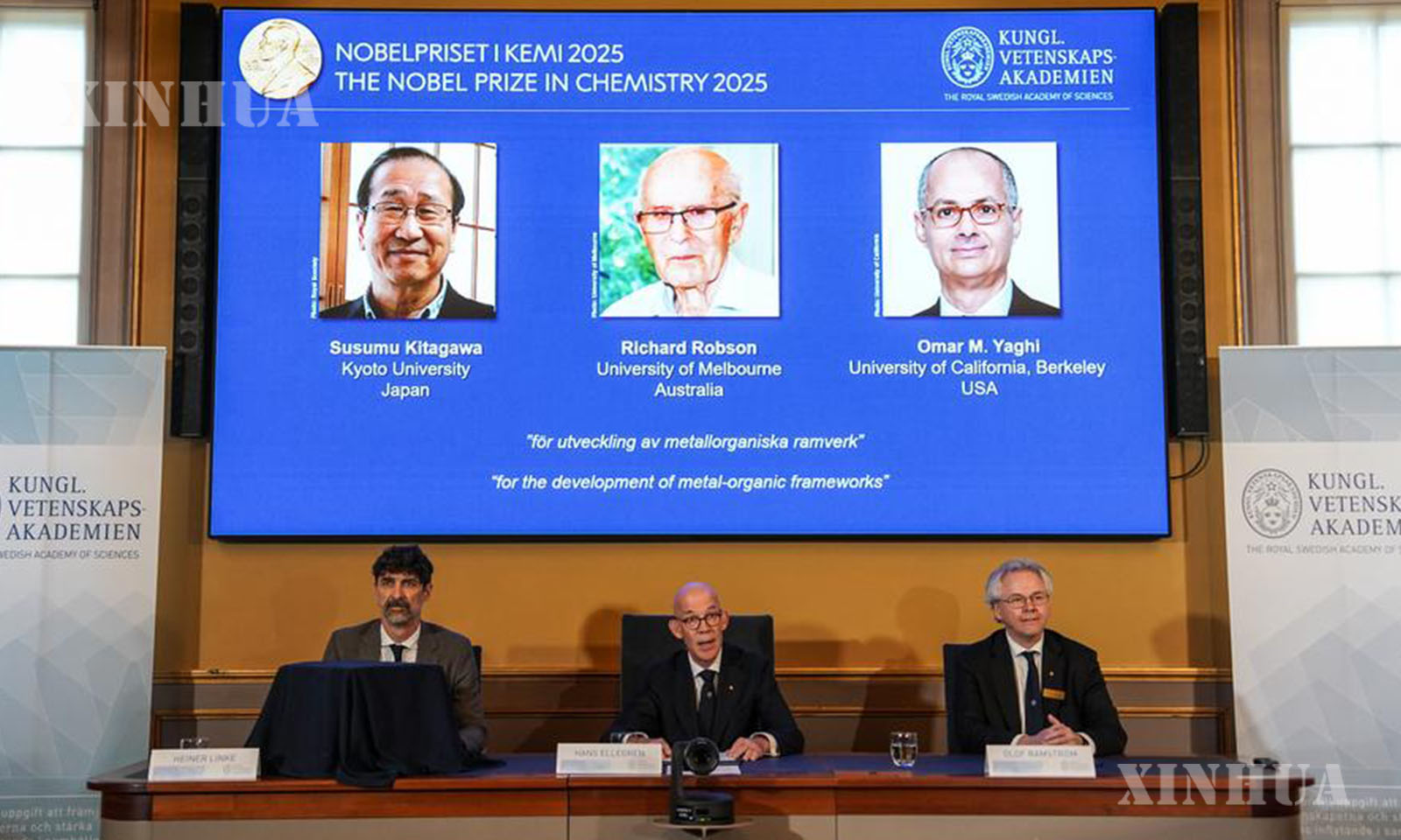 STOCKHOLM, Oct. 8 (Xinhua) — Susumu Kitagawa, Richard Robson and Omar M. Yaghi were awarded the 2025 Nobel Prize in Chemistry on Wednesday for developing metal-organic frameworks (MOFs), the Royal Swedish Academy of Sciences announced.