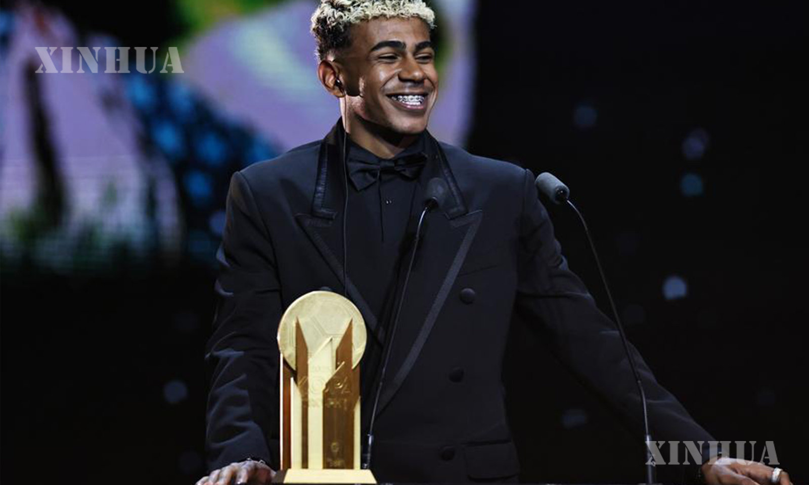 Barcelona’s Spanish player Lamine Yamal speaks after receiving the Kopa Trophy for the best under-21 player during the 2025 Ballon d’Or award ceremony at the Theatre du Chatelet in Paris, France, on Sept. 22, 2025. (Xinhua/Gao Jing)