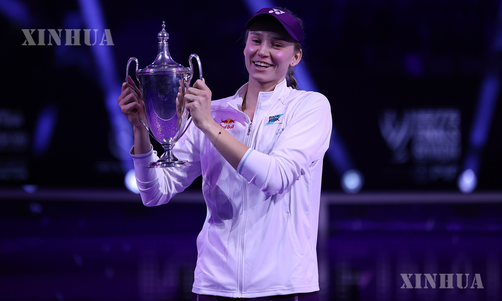 ဆော်ဒီအာရေဗျနိုင်ငံ ရီယတ်မြို့တွင် ၂၀၂၅ ခုနှစ် နိုဝင်ဘာ ၈ ရက်က ယှဉ်ပြိုင်ခဲ့သည့် WTA Finals အမျိုးသမီးတစ်ဦးချင်း တင်းနစ်ပြိုင်ပွဲ ဗိုလ်လုပွဲ၌ ဘီလာရုစ်တင်းနစ်မယ် အရီနာ ဆာဘလန်ကာကို အနိုင်ရပြီးနောက် ဆုဖလားနှင့်အတူ အောင်ပွဲခံနေသည့် ကာဇက်စတန်တင်းနစ်မယ် အယ်လီနာ ရေဘက်ကီနာအား တွေ့ရစဉ် (ဆင်ဟွာ)