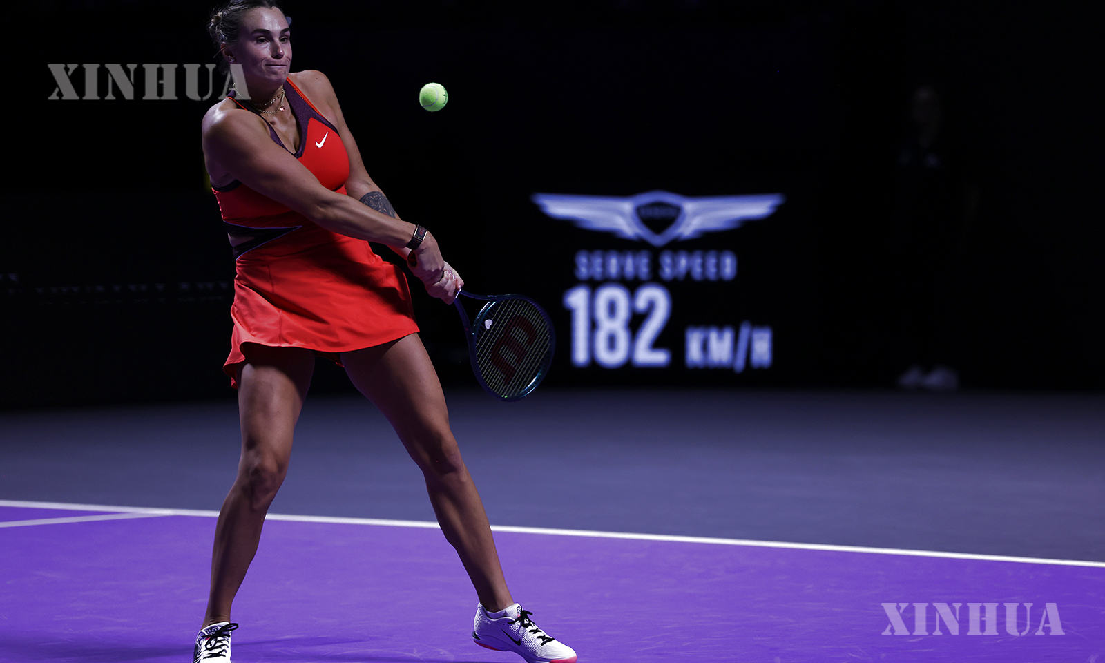 ဆော်ဒီအာရေဗျနိုင်ငံ ရီယတ်မြို့တွင် ၂၀၂၅ ခုနှစ် နိုဝင်ဘာ ၈ ရက်က ယှဉ်ပြိုင်ခဲ့သည့် WTA Finals အမျိုးသမီးတစ်ဦးချင်း တင်းနစ်ပြိုင်ပွဲ ဗိုလ်လုပွဲ၌ ကာဇက်စတန်တင်းနစ်မယ် အယ်လီနာ ရေဘက်ကီနာ၏ စပေးဘောအား တုံ့ပြန်နေသည့် ဘီလာရုစ်တင်းနစ်မယ် အရီနာ ဆာဘလန်ကာအား တွေ့ရစဉ် (ဆင်ဟွာ)