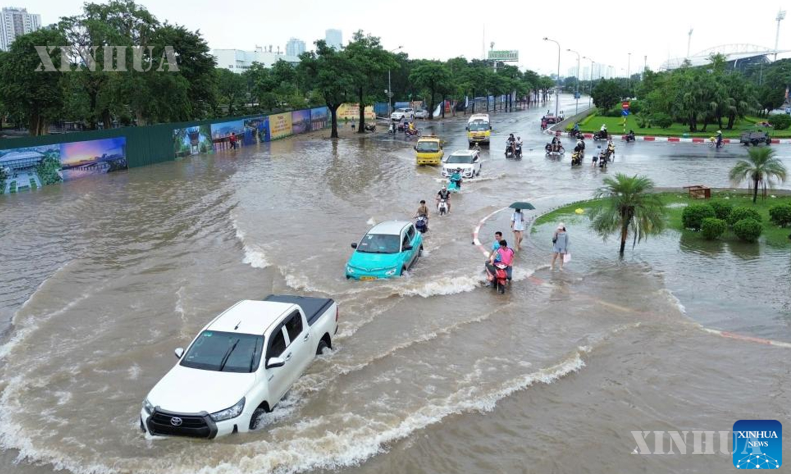 Vehicles drive through flooded streets in Hanoi, Vietnam, Oct. 7, 2025. (VNA/Handout via Xinhua)