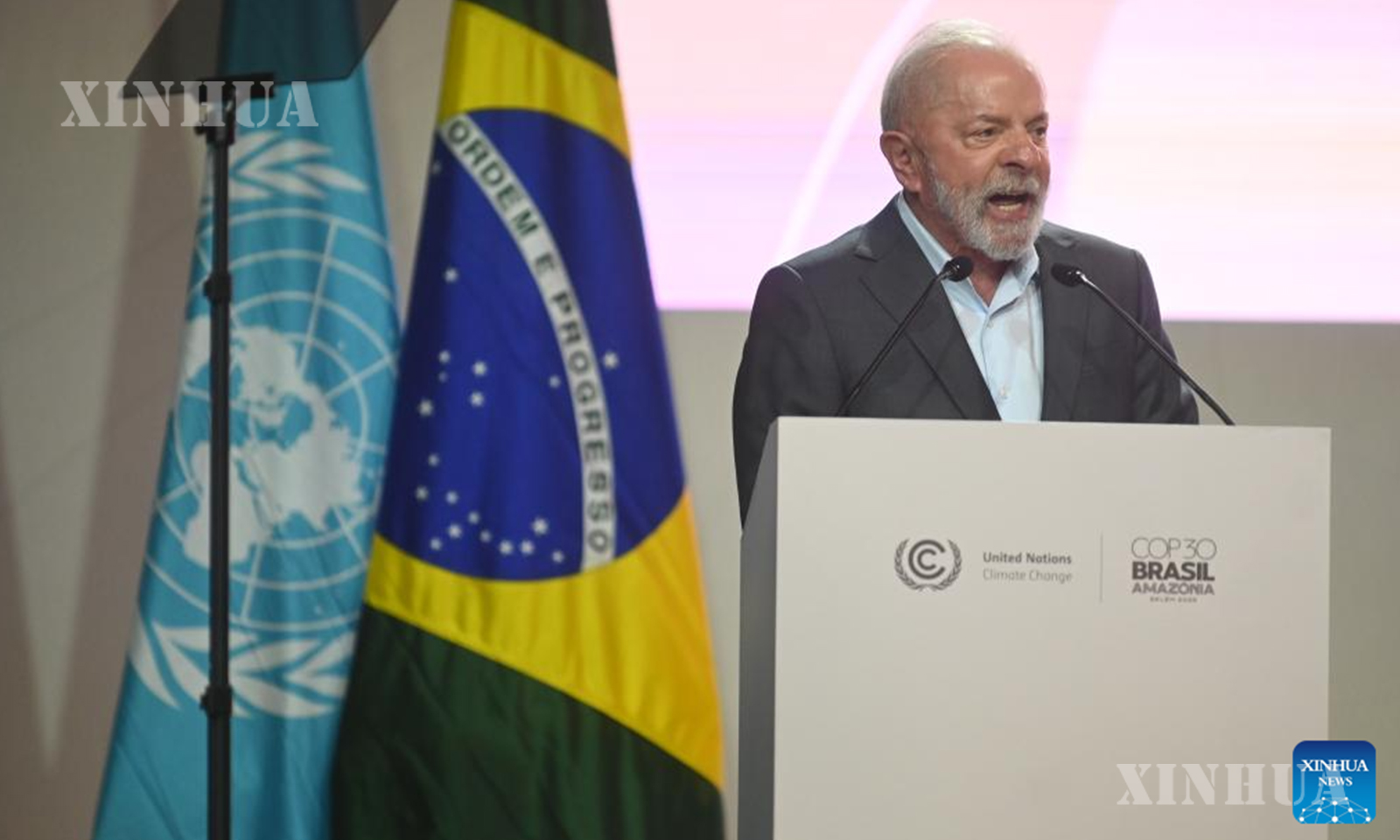 Brazilian President Luiz Inacio Lula da Silva speaks during the opening ceremony of the 30th United Nations climate change conference in Belem, Brazil, Nov. 10, 2025. (Photo by Claudia Martini/Xinhua)