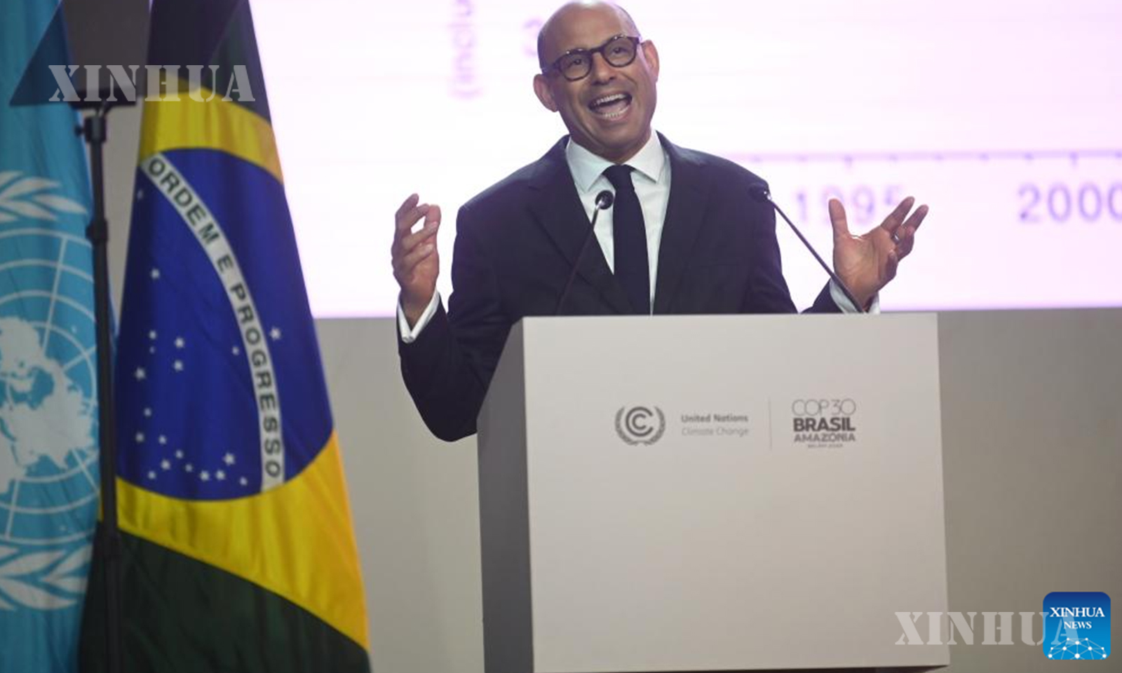 Simon Stiell, Executive Secretary of the United Nations Framework Convention on Climate Change (UNFCCC), speaks during the opening ceremony of the 30th United Nations climate change conference in Belem, Brazil, Nov. 10, 2025. (Photo by Claudia Martini/Xinhua)