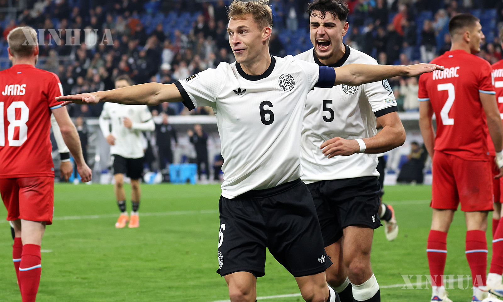 ဂျာမနီနိုင်ငံ ဆင်န်ရှိုင်းမြို့တွင် ၂၀၂၅ ခုနှစ် အောက်တိုဘာ ၁၀ ရက်က ဂျာမနီအသင်းနှင့် လူဇင်ဘတ်အသင်းတို့ ယှဉ်ပြိုင်ကစားခဲ့သည့် ၂၀၂၆ ခုနှစ် ကမ္ဘာ့ဖလား ဥရောပဇုန်ခြေစစ်ပွဲစဉ်၌ ဂျာမနီအသင်းမှ ဂျော်ရှူအာ ကင်းမစ်ချ် (ဝဲ-ဒုတိယ) နှင့် အလက်ဇန်းဒါး ပါဗလိုဗစ် (ဝဲ-တတိယ) တို့ ဂိုးသွင်းပြီးနောက် အောင်ပွဲခံနေစဉ် (ဆင်ဟွာ)