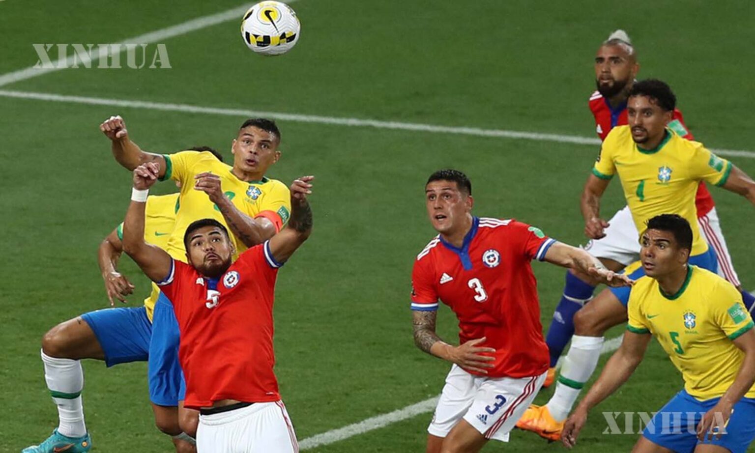 Photo : Thiago Silva (top L) of Brazil vies for a header during the 2022 FIFA World Cup qualifier between Brazil and Chile in Rio de Janeiro, Brazil on March 24, 2022. (Xinhua/Wang Tiancong)
