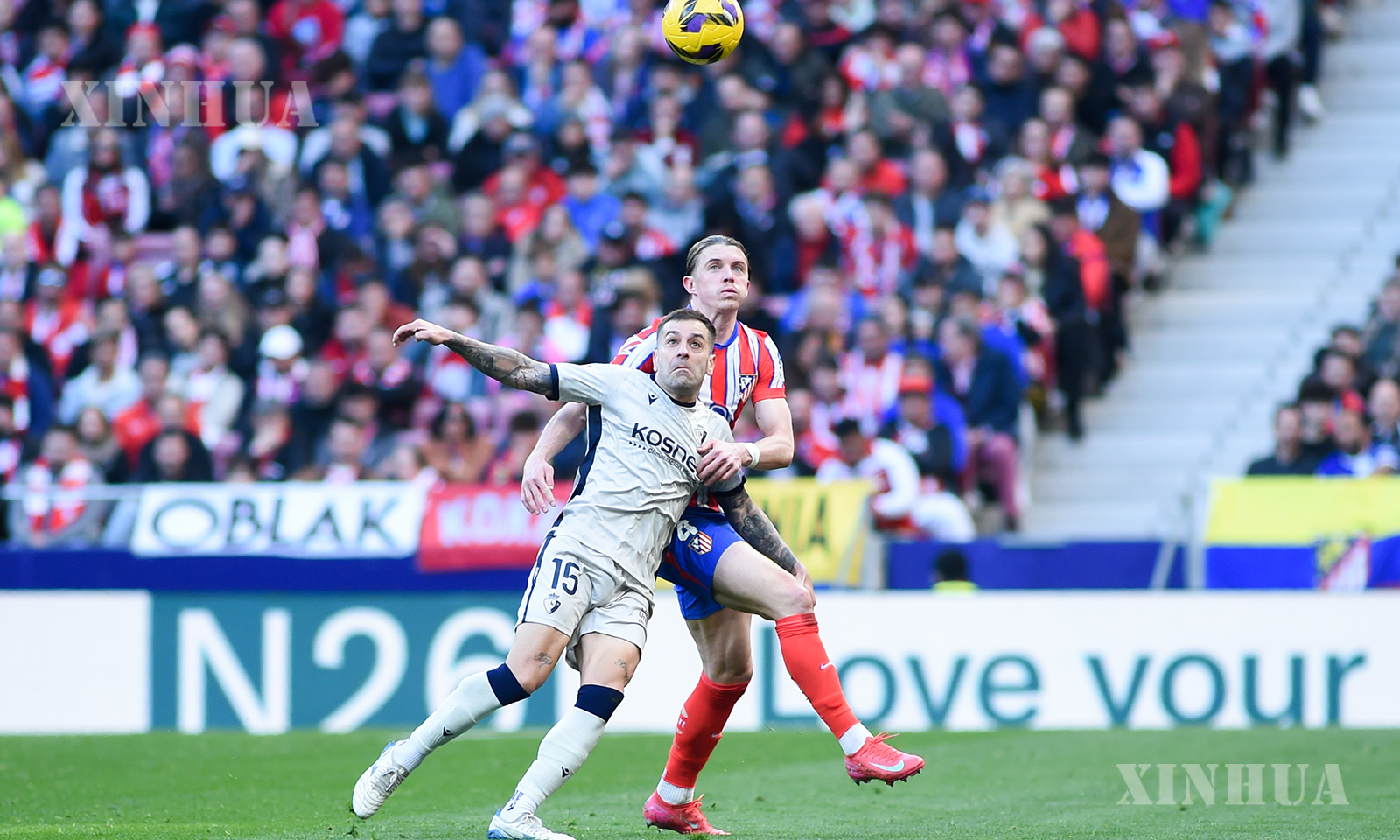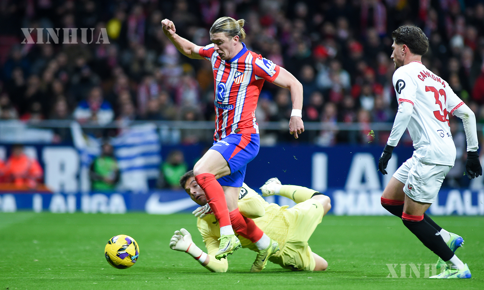 စပိန်နိုင်ငံ မက်ဒရစ်မြို့တွင် ၂၀၂၄ ခုနှစ် ဒီဇင်ဘာ ၈ ရက်က အက်သလက်တီကိုမက်ဒရစ်အသင်းနှင့် ဆီဗီလာအသင်းတို့ ယှဉ်ပြိုင်ကစားခဲ့သည့် လာလီဂါဘောလုံးပွဲစဉ်၌ ဆီဗီလာဂိုးသမား အယ်လ်ဗာရို ဖာနန်ဒက်ဇ် (အောက်) ကို ကျော်ဖြတ်ရန်ကြိုးစားနေသည့် ကော်နာ ဂယ်လက်ဂါ (အလယ်) အား တွေ့ရစဉ် (ဆင်ဟွာ)