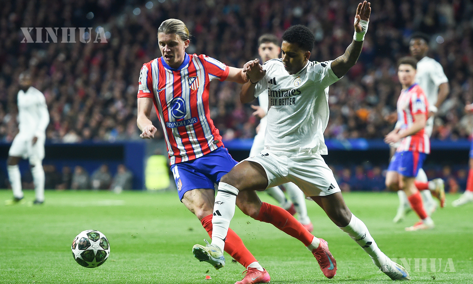 စပိန်နိုင်ငံ မက်ဒရစ်မြို့တွင် ၂၀၂၅ ခုနှစ် မတ် ၁၂ ရက်က အက်သလက်တီကိုမက်ဒရစ်အသင်းနှင့် ရီးရဲလ်မက်ဒရစ်အသင်းတို့ ယှဉ်ပြိုင်ကစားခဲ့သည့် ယူအီးအက်ဖ်အေ ချန်ပီယံလိဂ်ဘောလုံးပြိုင်ပွဲ ၁၆ သင်းအဆင့် ဒုတိယအကျော့ပွဲစဉ်၌ ရီးရဲလ်မက်ဒရစ်အသင်းမှ ရိုဒရီဂို (ယာ) နှင့် အက်သလက်တီကိုမက်ဒရစ် အသင်းမှ ကော်နာ ဂယ်လက်ဂါတို့ ယှဉ်ပြိုင်ကစားနေစဉ် (ဆင်ဟွာ)