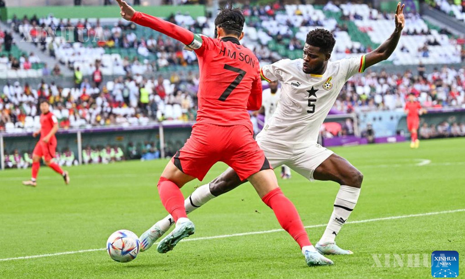 Photo : Son Heung-min (L) of South Korea vies with Thomas Partey of Ghana during the Group H match between South Korea and Ghana at the 2022 FIFA World Cup at Education City Stadium in Al Rayyan, Qatar, Nov. 28, 2022. (Xinhua/Xin Yuewei)