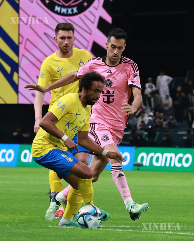 Inter Miami’s Sergio Busquets (R) defends Abdulmajeed Al-Sulaiheem of Al-Nassr during the friendly football match at the Kingdom Arena Stadium in Riyadh, Saudi Arabia, Feb. 1, 2024. (Xinhua/Wang Haizhou)
