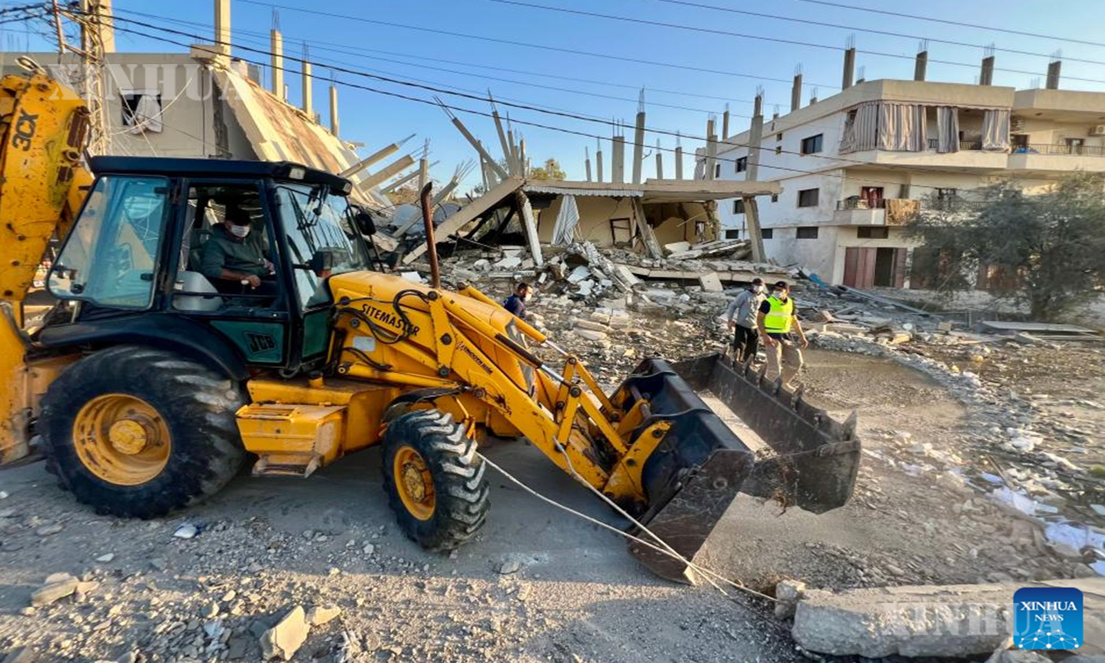 လက်ဘနွန်နိုင်ငံ တောင်ပိုင်း Deir Kifa မြို့တွင် ပျက်စီးသွားသော အဆောက်အအုံအပြိုအပျက်အရှေ့၌ လုပ်ငန်းဆောင်ရွက်နေသည့် မြေထိုးစက်ကို ၂၀၂၅ ခုနှစ် နိုဝင်ဘာ ၁၉ ရက်က တွေ့ရစဉ် (ဆင်ဟွာ)