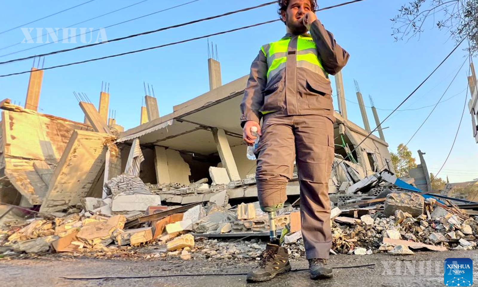 A medical worker with a prosthetic limb stands in front of the ruins of a building destroyed by Israeli airstrikes in Deir Kifa, southern Lebanon, Nov. 19, 2025. (Photo by Ali Hashisho/Xinhua)