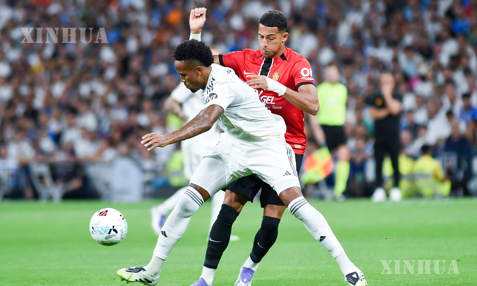 Eder Militao (front) of Real Madrid vies with Mateo Joseph of RCD Mallorca during the La Liga football match between Real Madrid and RCD Mallorca in Madrid, Spain, on Aug. 30, 2025. (Photo by Gustavo Valiente/Xinhua)
