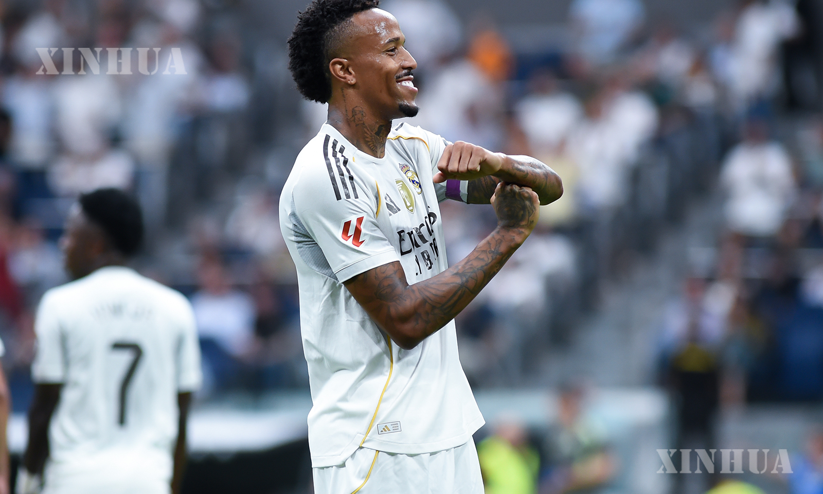 Eder Militao of Real Madrid celebrates a goal during the La Liga football match between Real Madrid and RCD Espanyol in Santiago Bernabeu Stadium, Madrid, Spain, Sept. 20, 2025. (Photo by Gustavo Valiente/Xinhua)