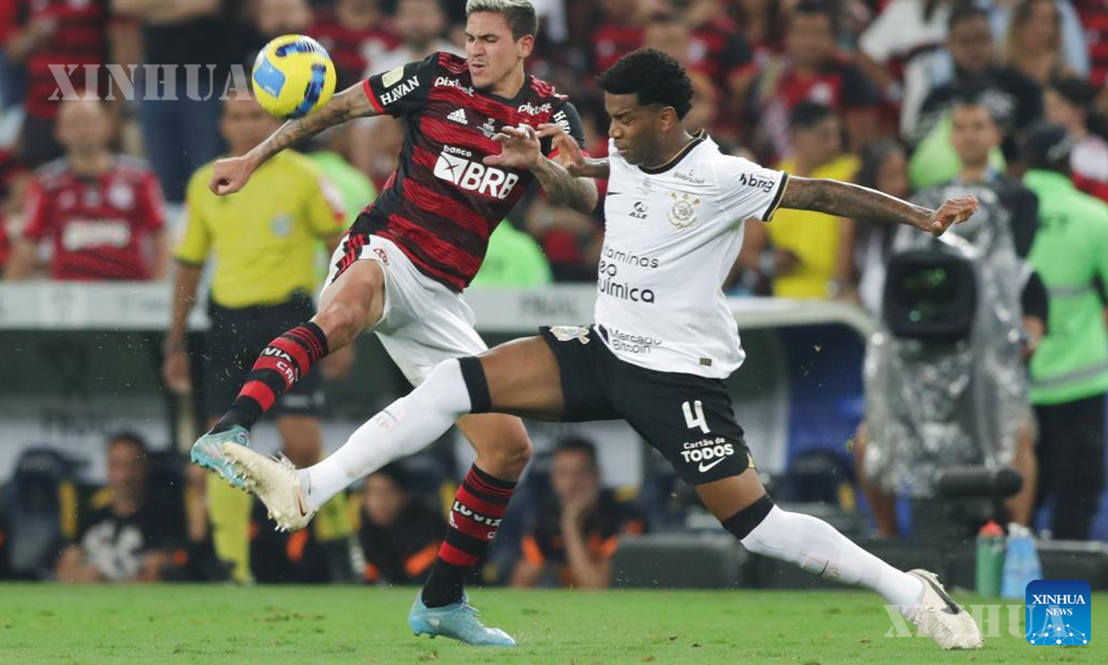Photo : Pedro (L) of Flamengo vies with Carlos Gilberto of Corinthians during the final of the Copa do Brasil 2022 in Rio de Janeiro, Brazil, Oct. 19, 2022. (Xinhua/Wang Tiancong)