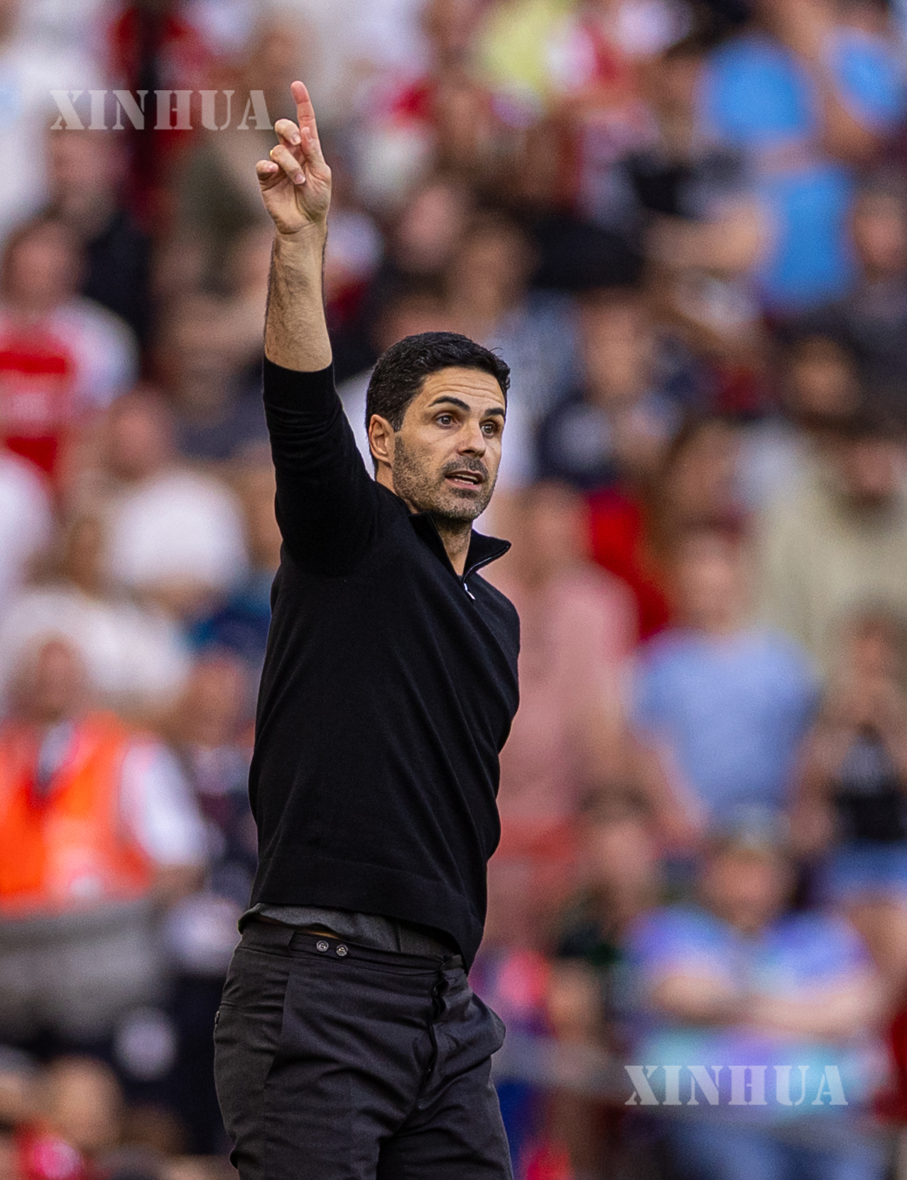 ဗြိတိန်နိုင်ငံ လီဗာပူးလ်မြို့တွင် ၂၀၂၅ ခုနှစ် မေ ၁၁ ရက်က လီဗာပူးလ်အသင်းနှင့် အာဆင်နယ်အသင်းတို့ ယှဉ်ပြိုင်ကစားခဲ့သည့် အင်္ဂလိပ်ပရီးမီးယားလိဂ်ပွဲစဉ်၌ အာဆင်နယ်အသင်းမန်နေဂျာ မစ်ကယ် အာတေတာ ခြေဟန်လက်ဟန်ဖြင့် ညွှန်ကြားနေပုံကို တွေ့ရစဉ် (ဆင်ဟွာ)