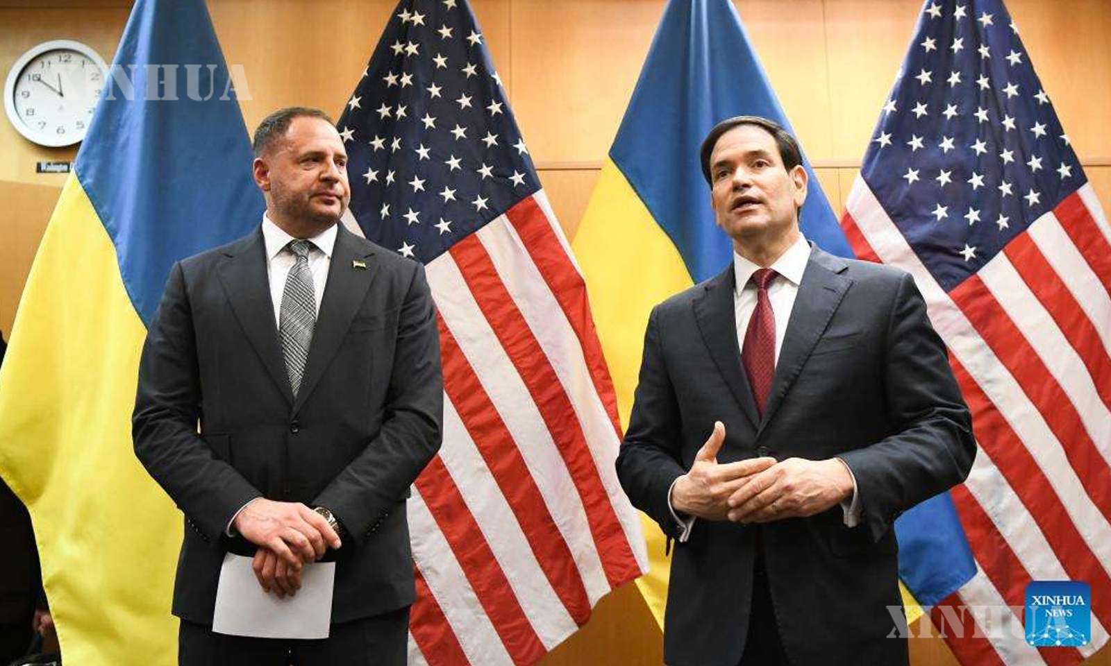 U.S. Secretary of State Marco Rubio (R) and Andriy Yermak, head of the Ukrainian Presidential Office, meet the press at the United States Mission to the United Nations and Other International Organizations in Geneva, Switzerland, Nov. 23, 2025. (Xinhua)