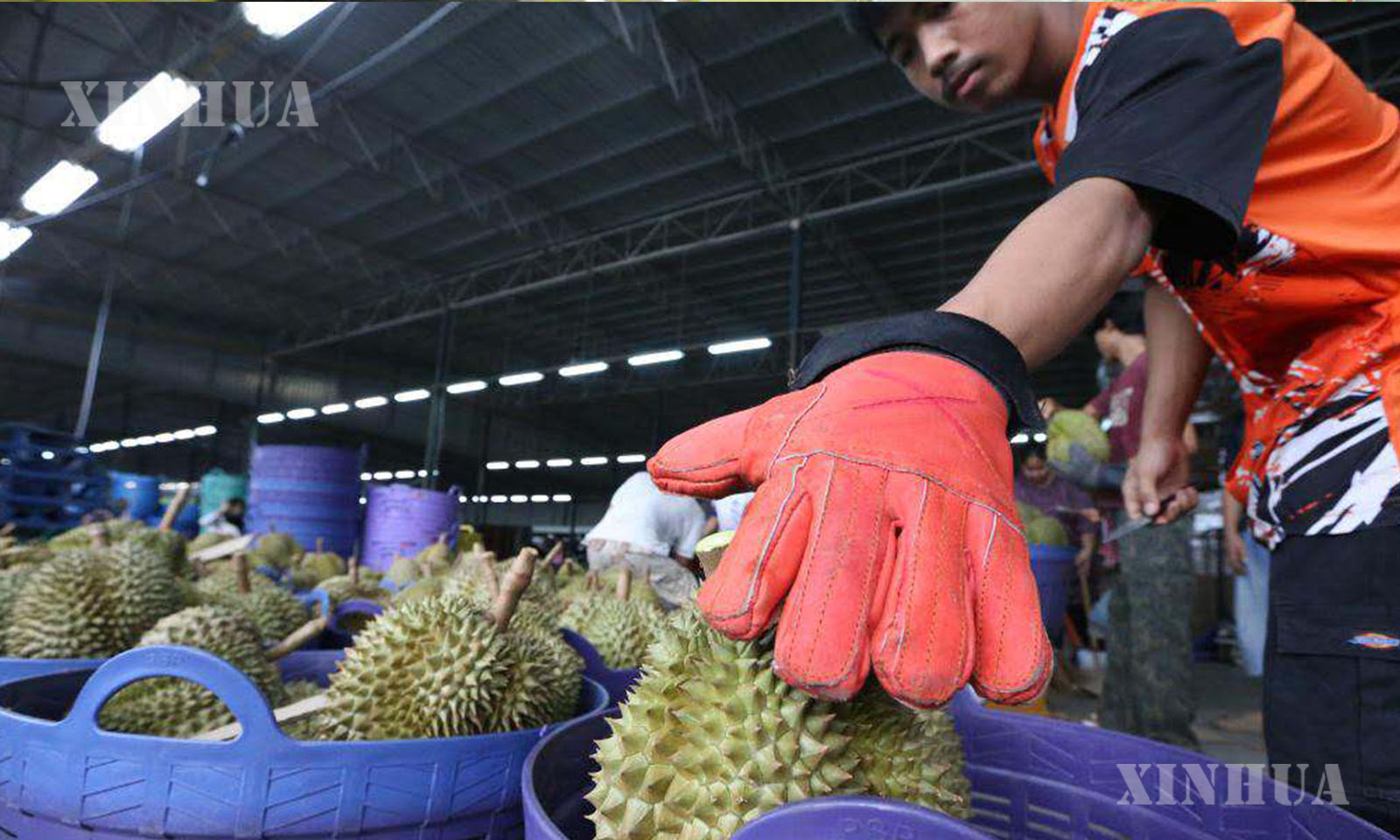 Workers sort durians with gloves at Long durian center in Chanthaburi, Thailand, May 13, 2025. (Xinhua/Rachen Sageamsak)