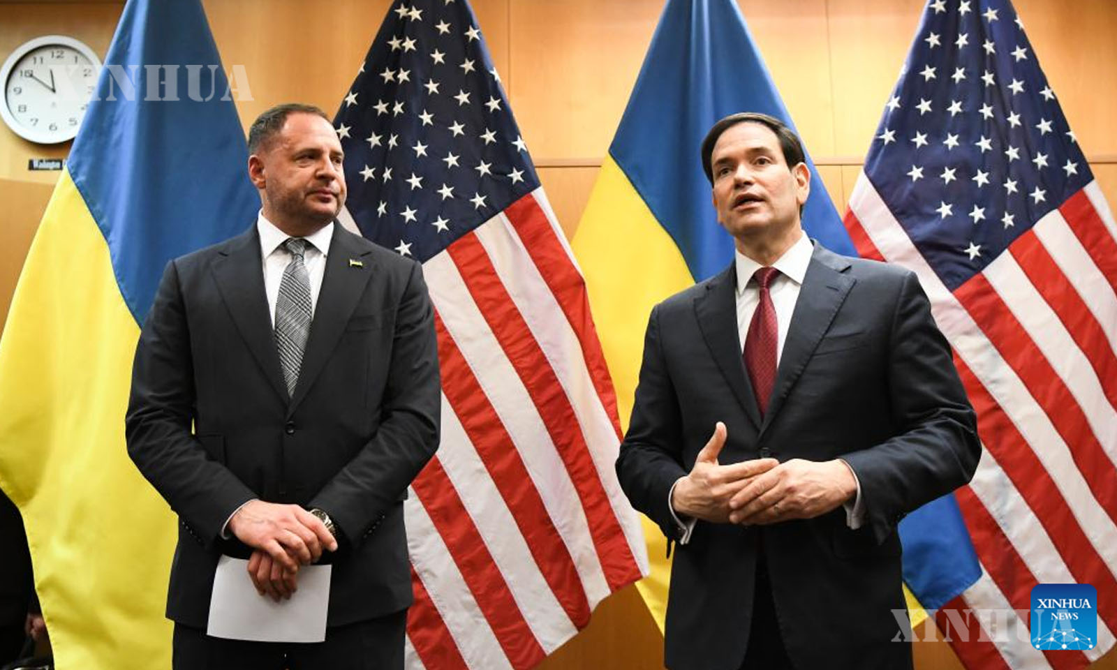 U.S. Secretary of State Marco Rubio (R) and Andriy Yermak, head of the Ukrainian Presidential Office, meet the press at the United States Mission to the United Nations and Other International Organizations in Geneva, Switzerland, Nov. 23, 2025. (Xinhua/Lian Yi)