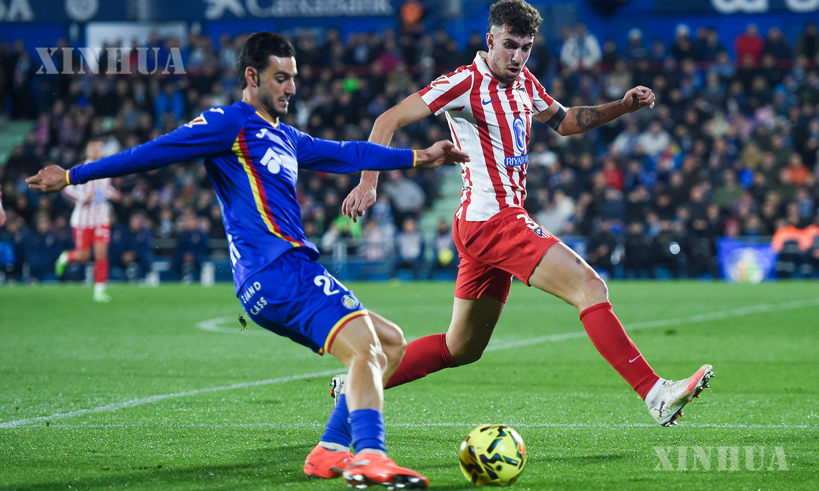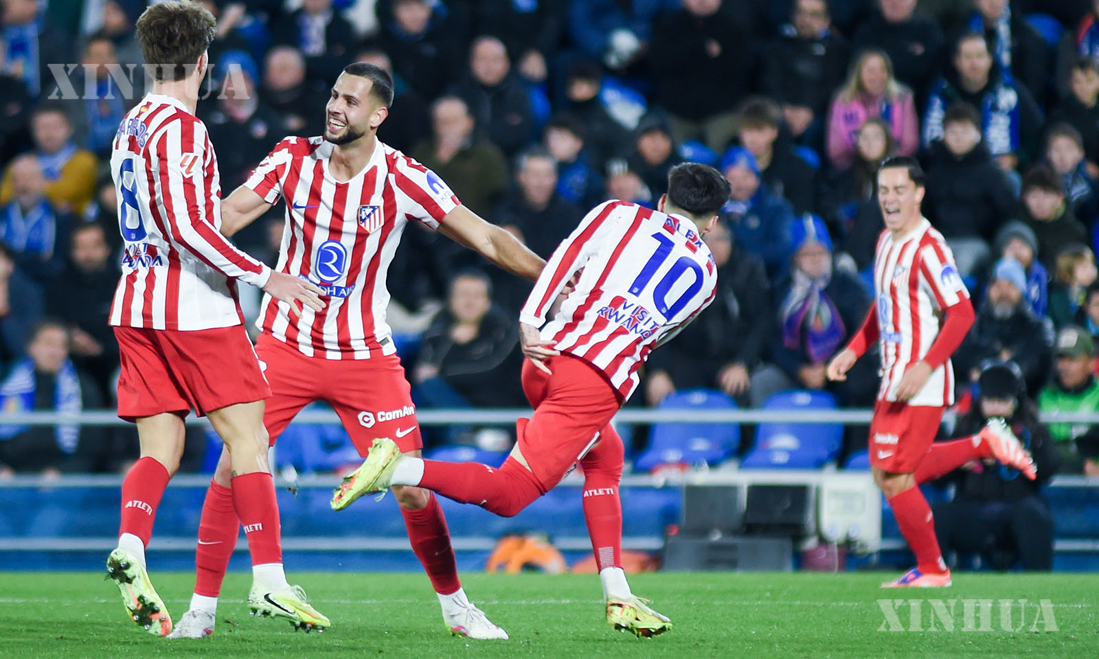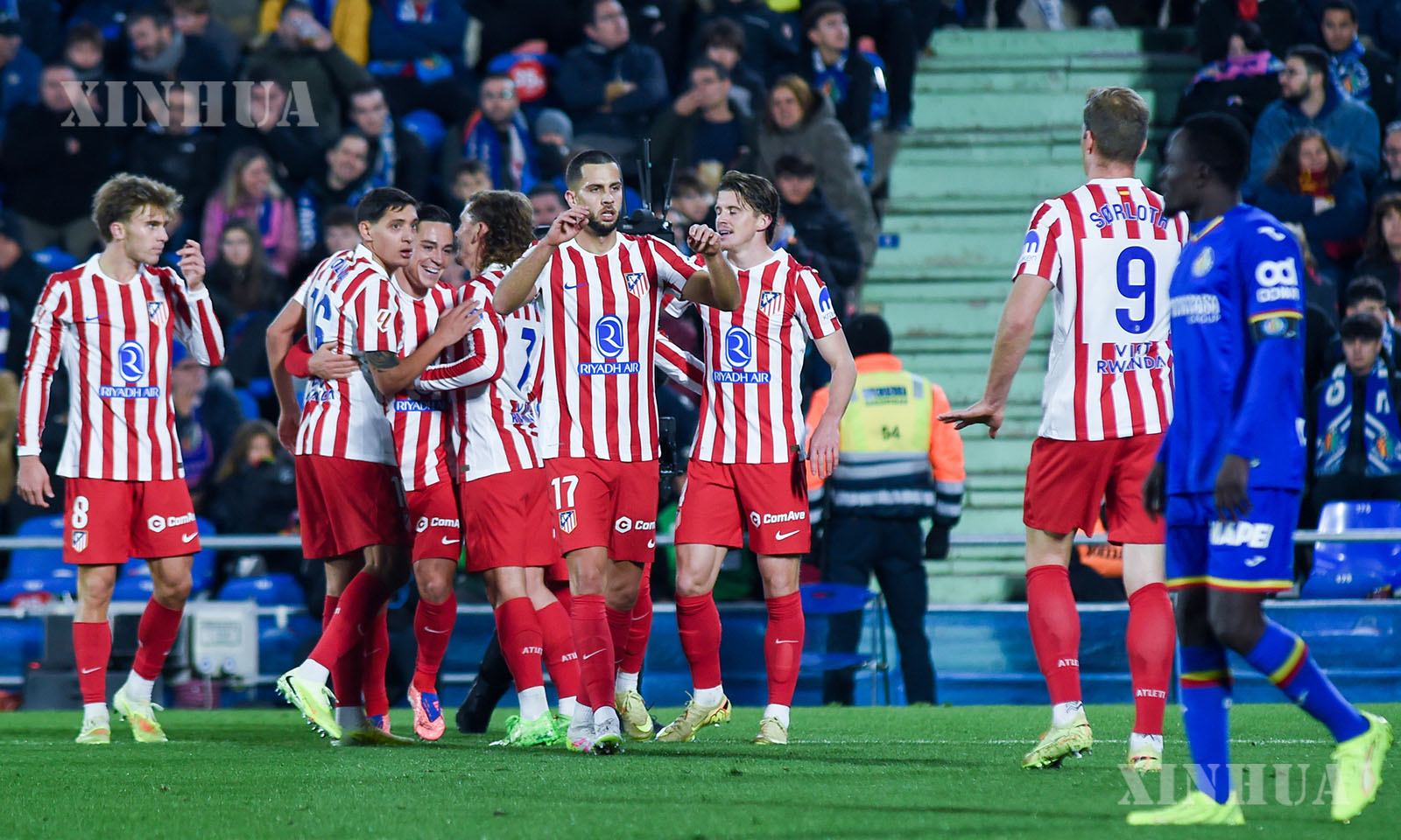 Atletico de Madrid’s players celebrate after Domingos Duarte of Getafe scoring an own goal during La Liga football match between Getafe CF and Atletico de Madrid in Getafe, Madrid, Spain, on Nov. 23, 2025. (Photo by Gustavo Valiente/Xinhua)
