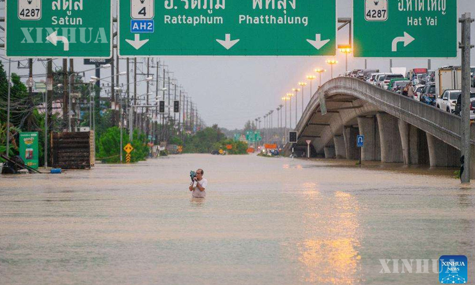 ထိုင်းနိုင်ငံ၊ ဆုန်ခလာပြည်နယ်ရှိ ဟတ်ယိုင်မြို့ ဆင်ခြေဖုံးအရပ်မှ ရေကြီးနေသော နေရာတစ်ခုကို ဖြတ်သန်းသွားလာနေသော အမျိုးသားတစ်ဦးကို ၂၀၂၅ ခုနှစ် နိုဝင်ဘာ ၂၅ ရက်က တွေ့ရစဥ် (ဆင်ဟွာ)