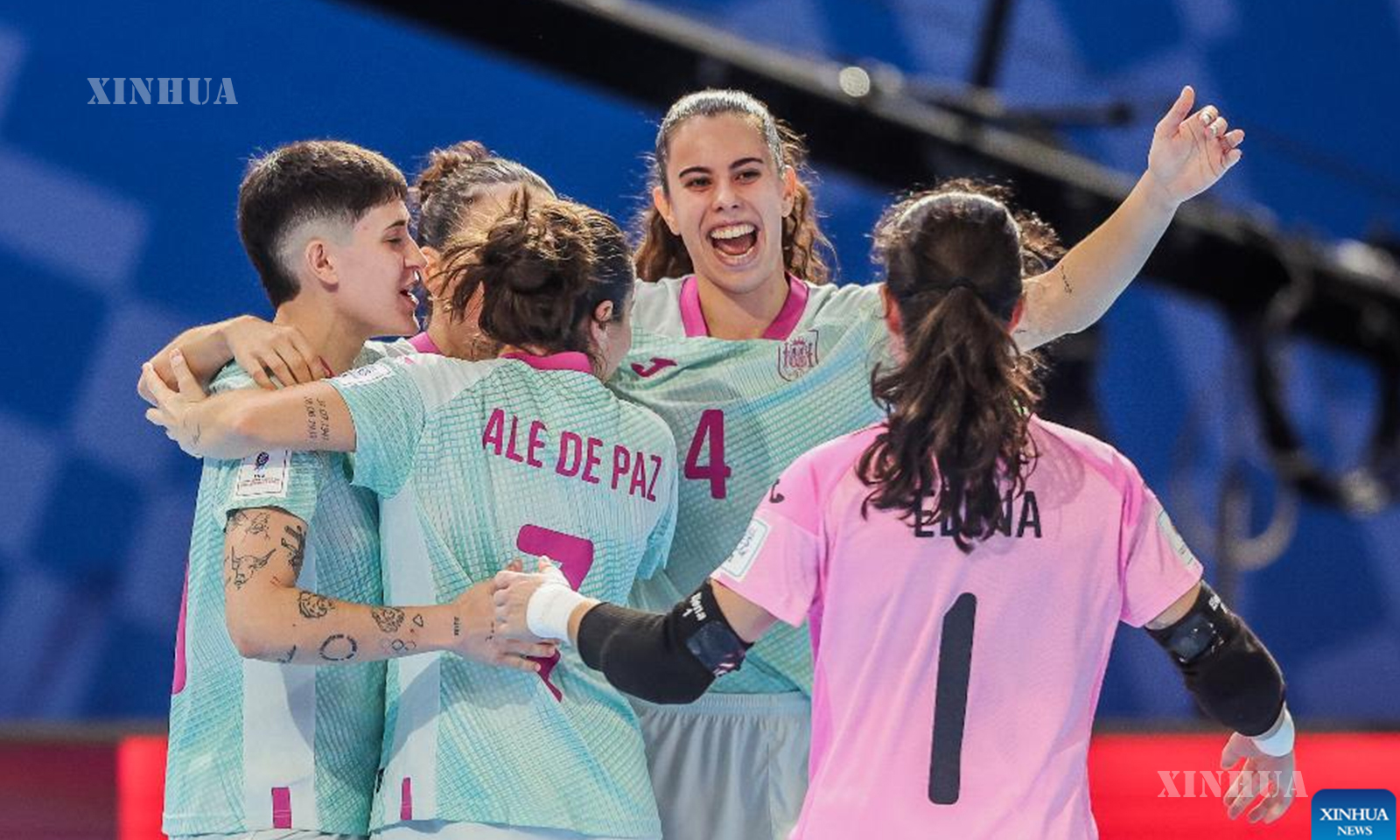Players of Spain celebrate after scoring a goal during the group B match between Spain and Colombia at the FIFA Futsal Women’s World Cup 2025 in Pasig City, the Philippines, Nov. 25, 2025. (Xinhua/Rouelle Umali)