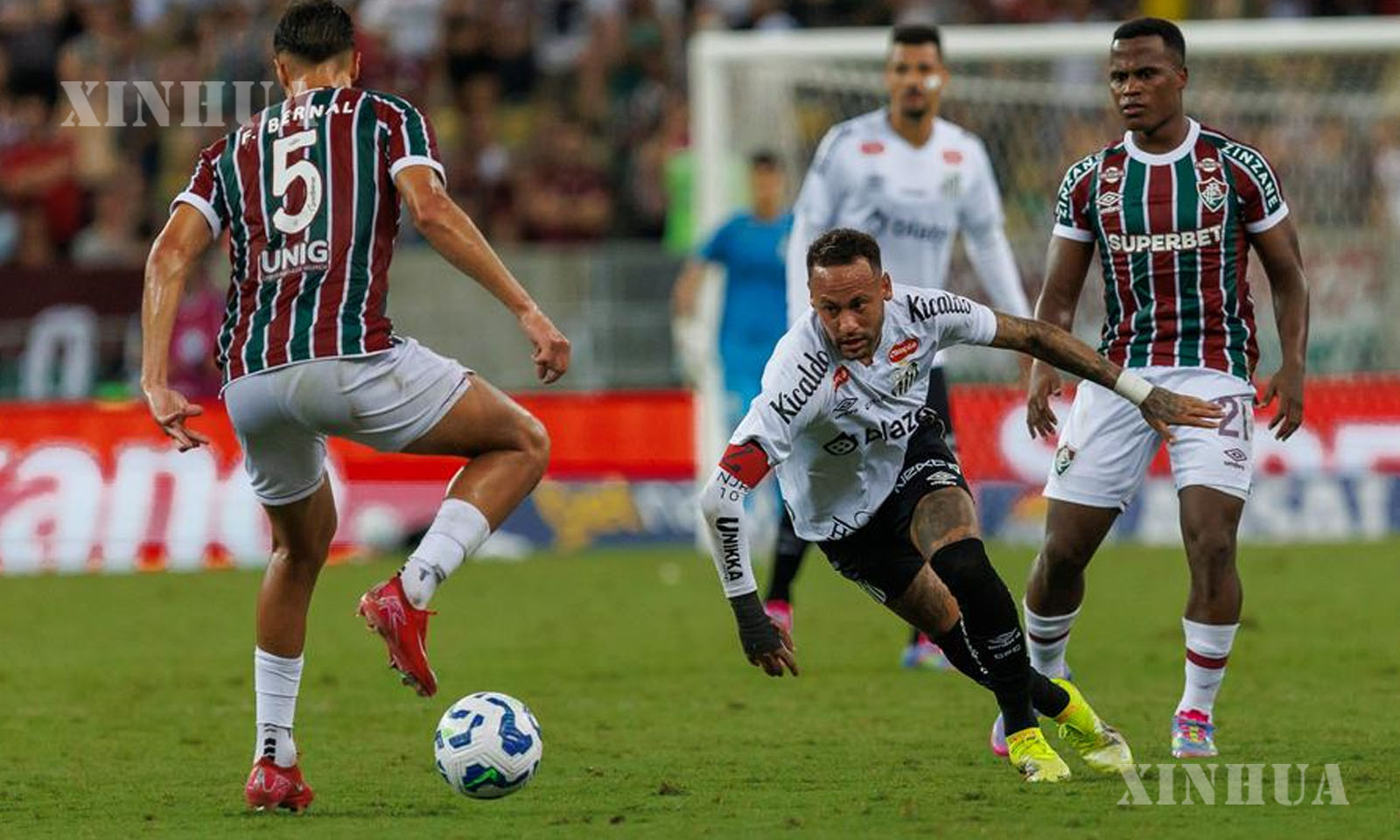 Photo : Santos’ Neymar (c) vies with Fluminense’s Facundo Bernal during the match of the Brazilian Serie A Championship in Rio de Janeiro, Brazil, April 13, 2025. (Xinhua/Claudia Martini)