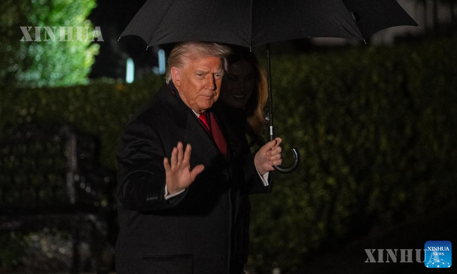 အမေရိကန်နိုင်ငံ မြို့တော်ဝါရှင်တန်ဒီစီရှိ အိမ်ဖြူတော်မှ ထွက်ခွာသွားသည့် အမေရိကန်နိုင်ငံ သမ္မတ ဒေါ်နယ်ထရမ့်နှင့် သမ္မတကတော် မယ်လန်နီယာ ထရမ့်တို့ကို ၂၀၂၅ ခုနှစ် နိုဝင်ဘာ ၂၅ ရက်က တွေ့ရစဉ် (ဆင်ဟွာ)