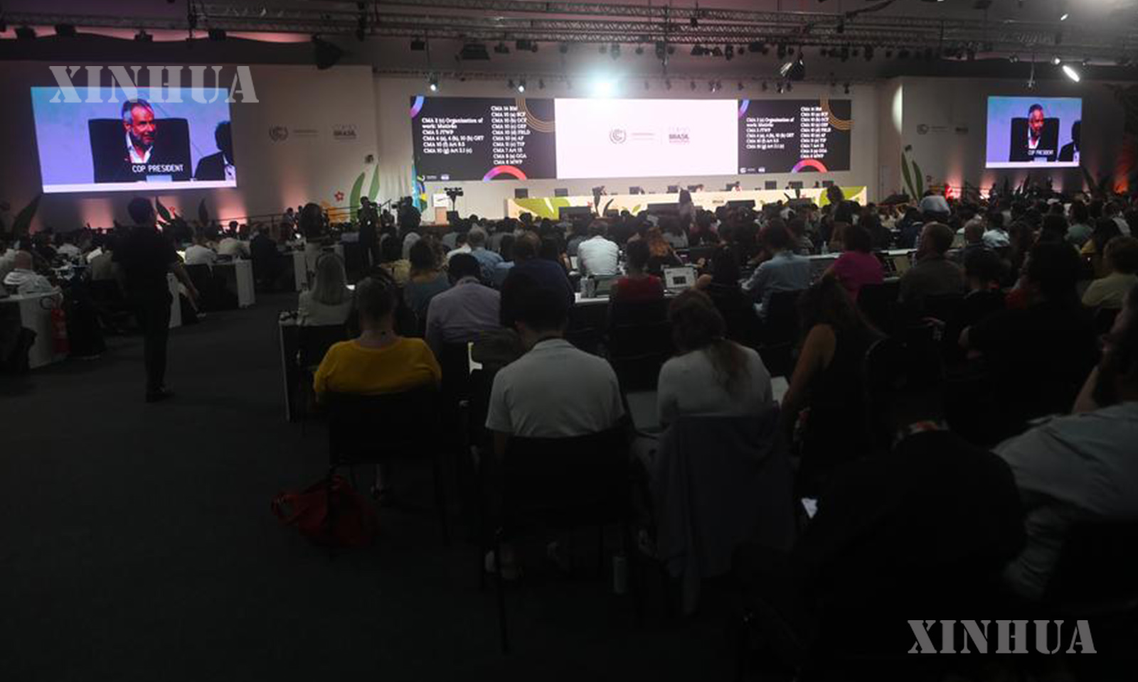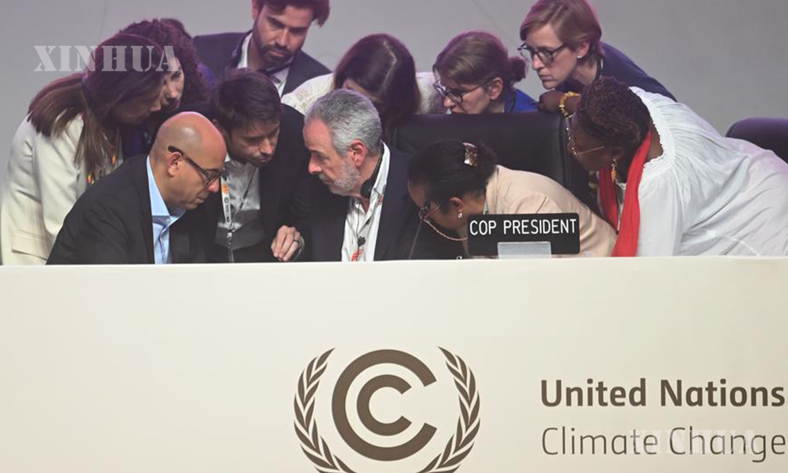 Photo 3: President of the 30th United Nations Climate Change Conference (COP30) Andre Correa do Lago (2nd L, front) discusses with UN Climate Change Executive Secretary Simon Stiell (1st L, front) and other staff members during a plenary session of the COP30 in Belem, Brazil, on Nov. 22, 2025. (Photo by Lucio Tavora/Xinhua)
