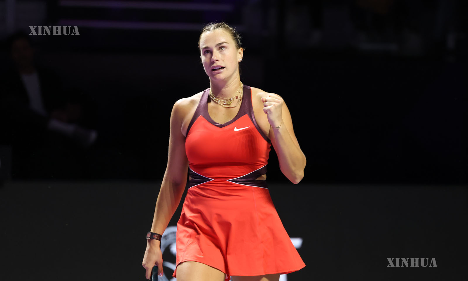 ဆော်ဒီနိုင်ငံ ရီယတ်ဒ်မြို့တွင် ကျင်းပသည့် ပြိုင်ပွဲဝင်ငါးဦး ပတ်လည်စနစ်ဖြင့် ယှဉ်ပြိုင်ရသော WTA Finals တင်းနစ်ပြိုင်ပွဲ၏ ပွဲစဉ်တစ်ပွဲ၌ အီတလီတင်းနစ်မယ် ဂျက်စမင် ပေါင်လီနီအား အနိုင်ရပြီးနောက် အောင်ပွဲခံနေသည့် ဘီလာရုစ်တင်းနစ်မယ် အရီနာ ဆာဘလန်ကာအား ၂၀၂၅ ခုနှစ် နိုဝင်ဘာ ၂ ရက်က တွေ့ရစဉ် (ဆင်ဟွာ)