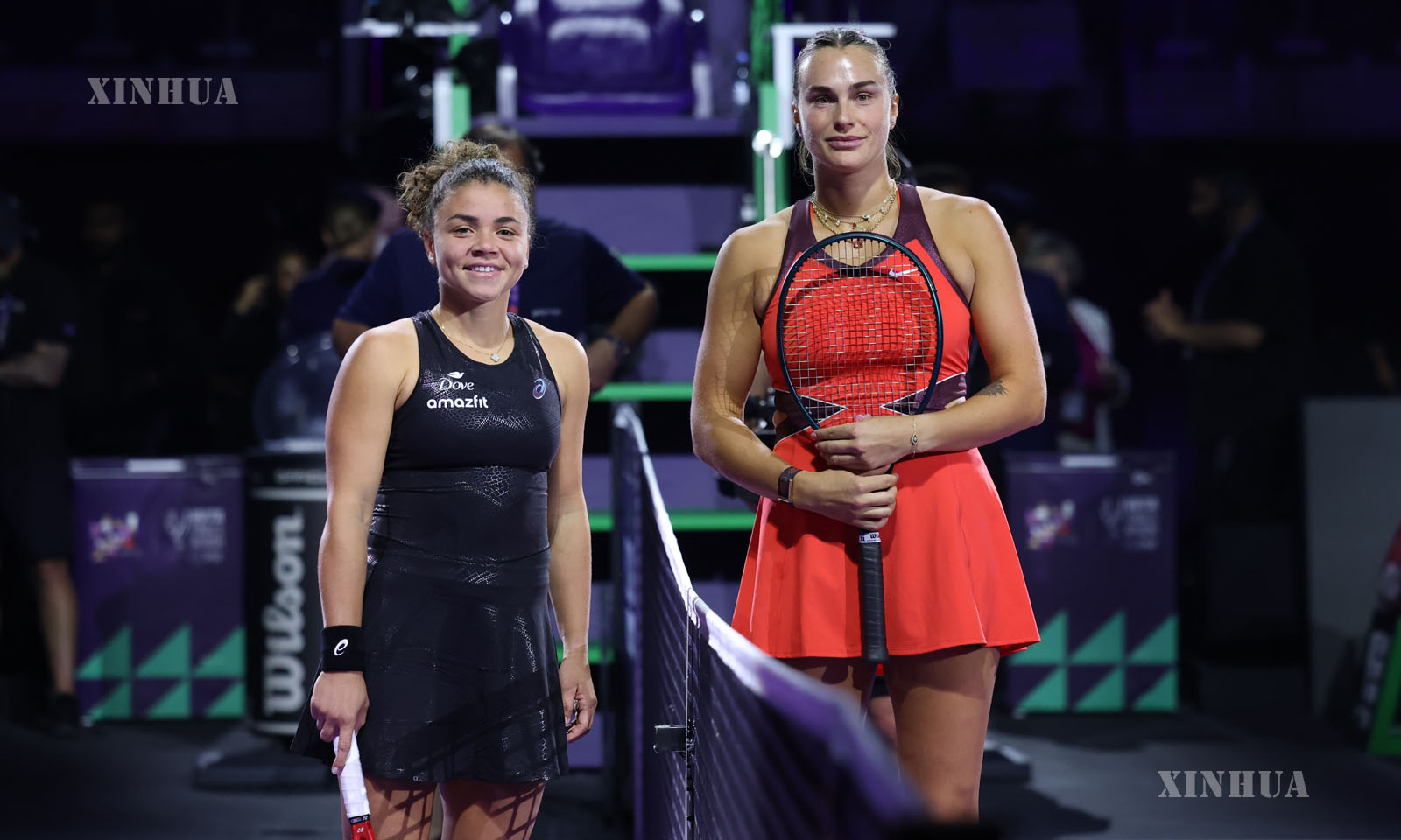 ဆော်ဒီနိုင်ငံ ရီယတ်ဒ်မြို့တွင် ကျင်းပသည့် ပြိုင်ပွဲဝင်ငါးဦး ပတ်လည်စနစ်ဖြင့် ယှဉ်ပြိုင်ရသော WTA Finals တင်းနစ်ပြိုင်ပွဲ၏ ပွဲစဉ်တစ်ပွဲအဖြစ် အီတလီတင်းနစ်မယ် ဂျက်စမင် ပေါင်လီနီ (ဝဲ) နှင့် ဘီလာရုစ်တင်းနစ်မယ် အရီနာ ဆာဘလန်ကာတို့ ယှဉ်ပြိုင်မကစားမီ အမှတ်တရဓာတ်ပုံရိုက်နေသည်ကို ၂၀၂၅ ခုနှစ် နိုဝင်ဘာ ၂ ရက်က တွေ့ရစဉ် (ဆင်ဟွာ)