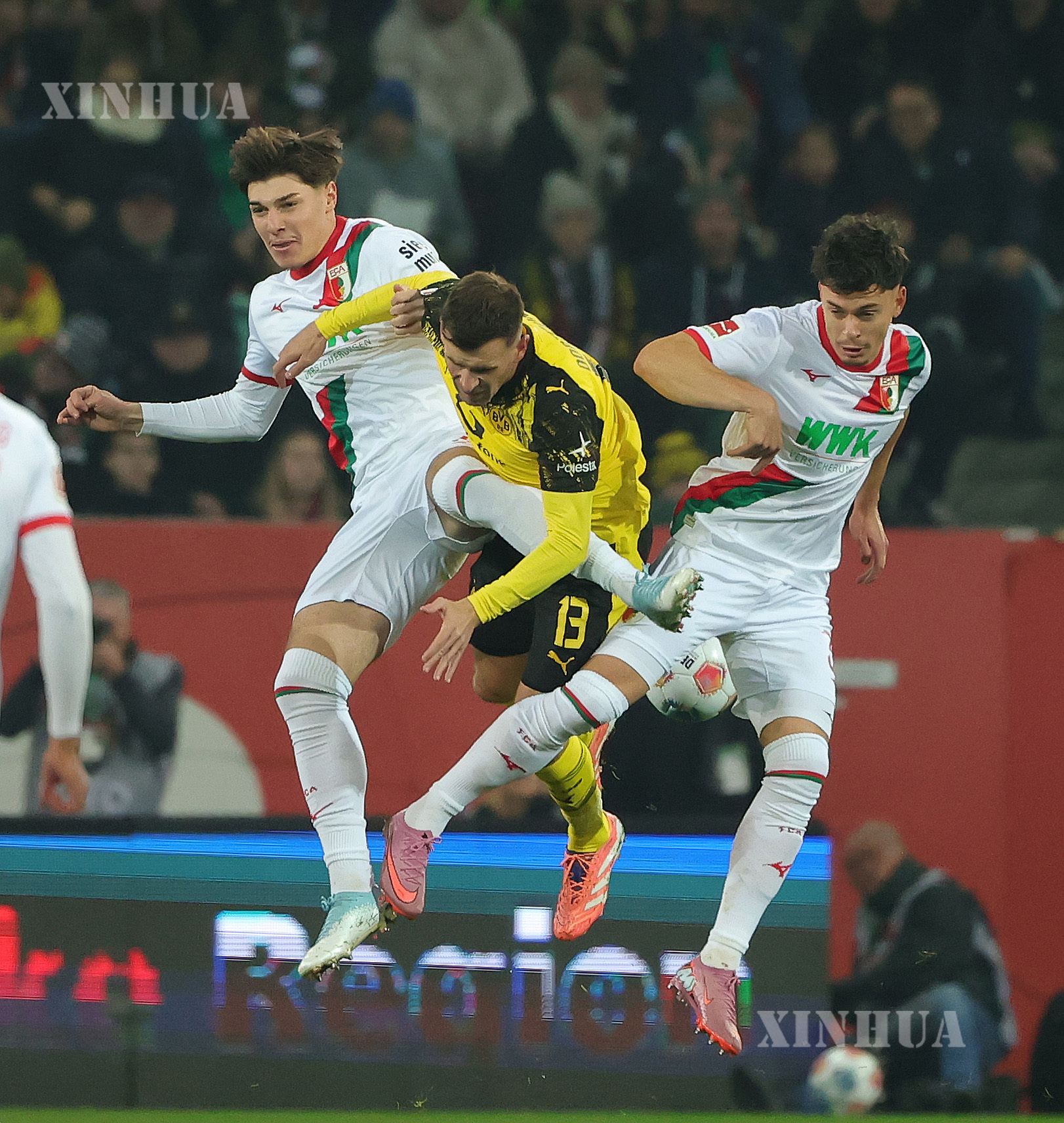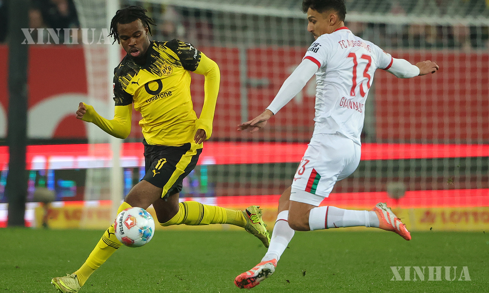 Dimitris Giannoulis (R) of FC Augsburg vies with Carney Chukwuemeka of Borussia Dortmund during the German first division Bundesliga football match between FC Augsburg and Borussia Dortmund in Augsburg, Germany, Oct. 31, 2025. (Photo by Philippe Ruiz/Xinhua)