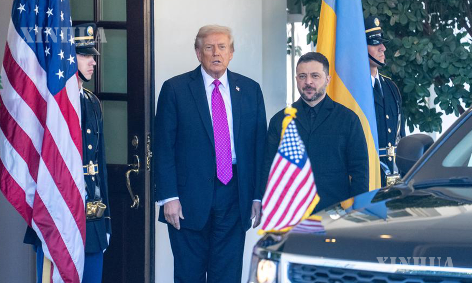 U.S. President Donald Trump (2nd L) welcomes Ukrainian President Volodymyr Zelensky at the White House in Washington, D.C., the United States, Oct 17, 2025. (Xinhua/Hu Yousong)