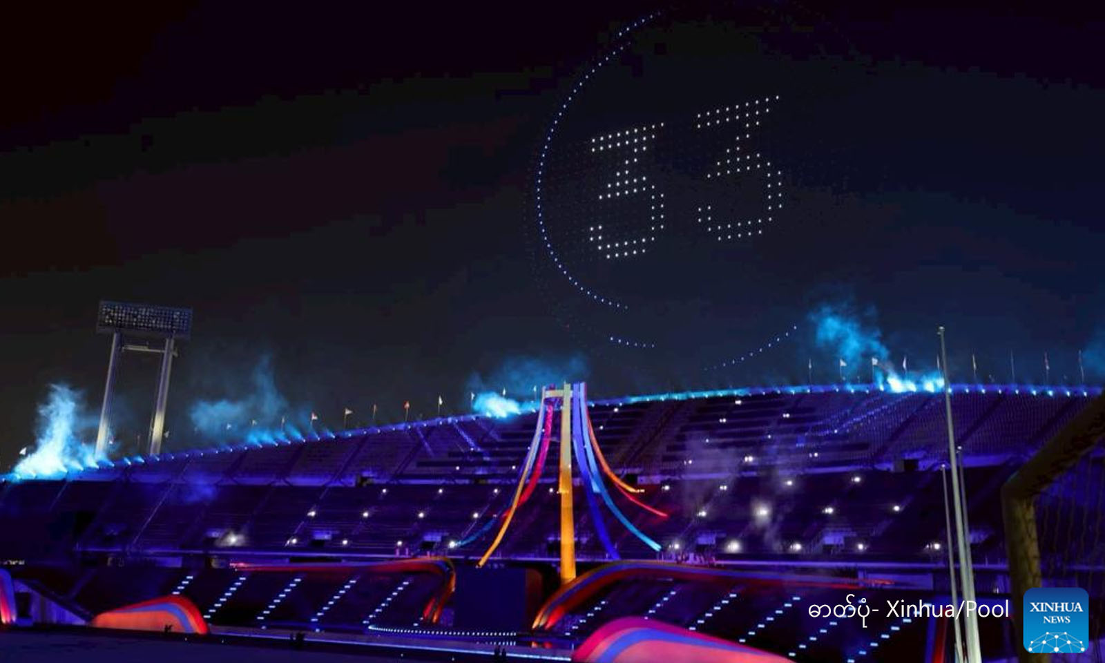 ထိုင်းနိုင်ငံ ဘန်ကောက်မြို့တွင် ကျင်းပသည့် ၃၃ ကြိမ်မြောက် အ‌ရှေ့တောင်အာရှ အားကစားပြိုင်ပွဲ ဖွင့်ပွဲအခမ်းအနား၌ ဒရုန်းဖြင့် မီးအလှဆင်သရုပ်ပြမှုအား ပရိသတ်များ ကြည့်ရှုနေပုံကို ၂၀၂၅ ခုနှစ် ဒီဇင်ဘာ ၉ ရက်က တွေ့ရစဉ် (ဓာတ်ပုံ- Xinhua/Pool)