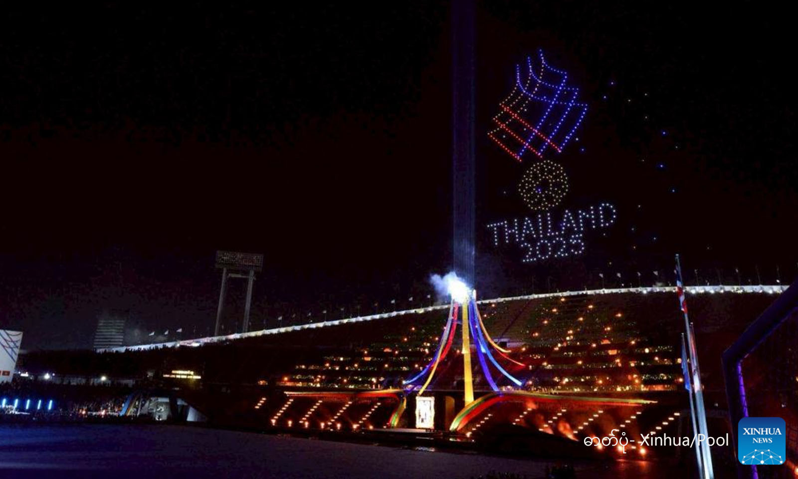 ထိုင်းနိုင်ငံ ဘန်ကောက်မြို့တွင် ကျင်းပသည့် ၃၃ ကြိမ်မြောက် အ‌ရှေ့တောင်အာရှ အားကစားပြိုင်ပွဲ ဖွင့်ပွဲအခမ်းအနား၌ ဒရုန်းဖြင့် မီးအလှဆင်သရုပ်ပြမှုအား ပရိသတ်များ ကြည့်ရှုနေပုံကို ၂၀၂၅ ခုနှစ် ဒီဇင်ဘာ ၉ ရက်က တွေ့ရစဉ် (ဓာတ်ပုံ- Xinhua/Pool)