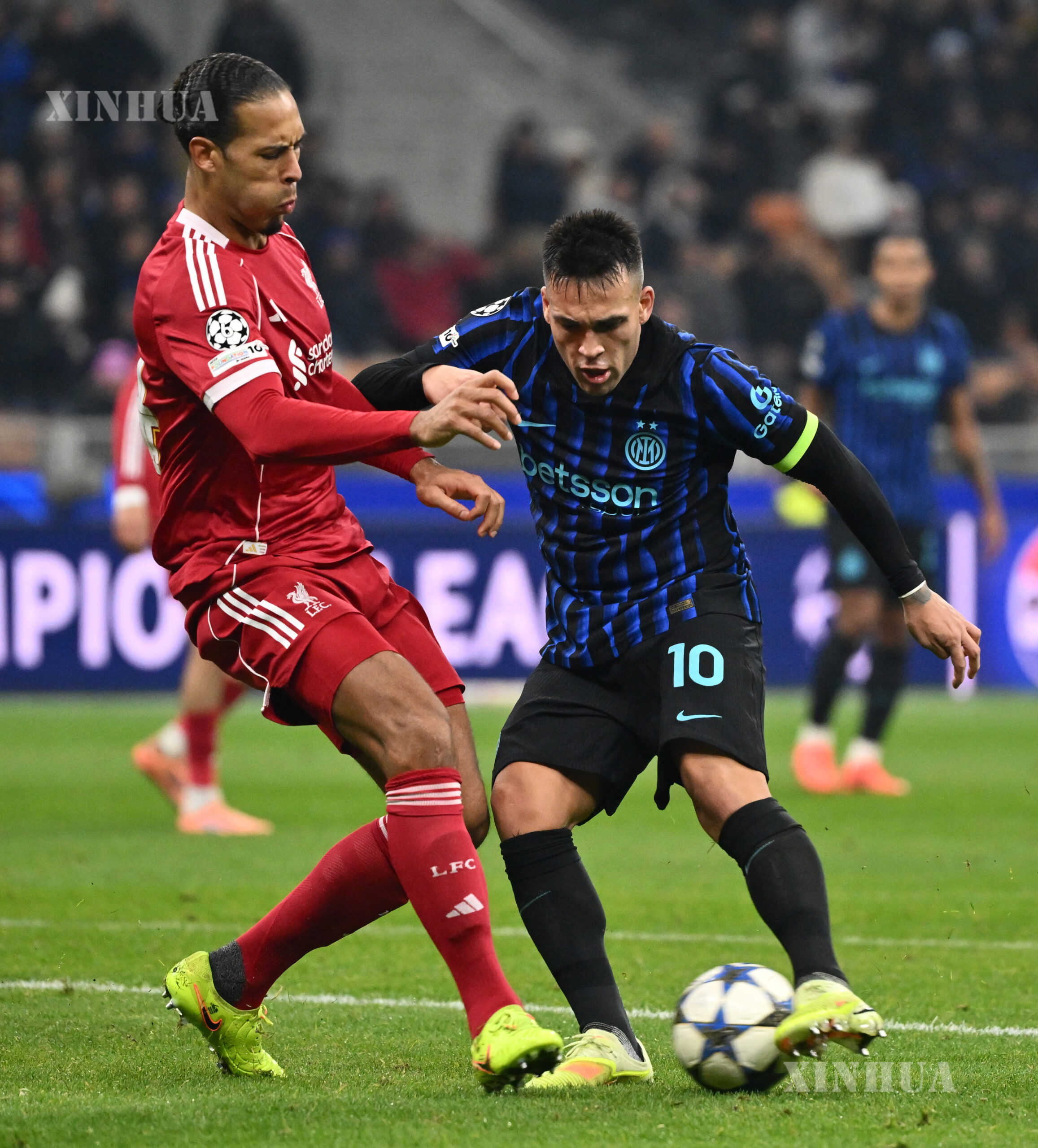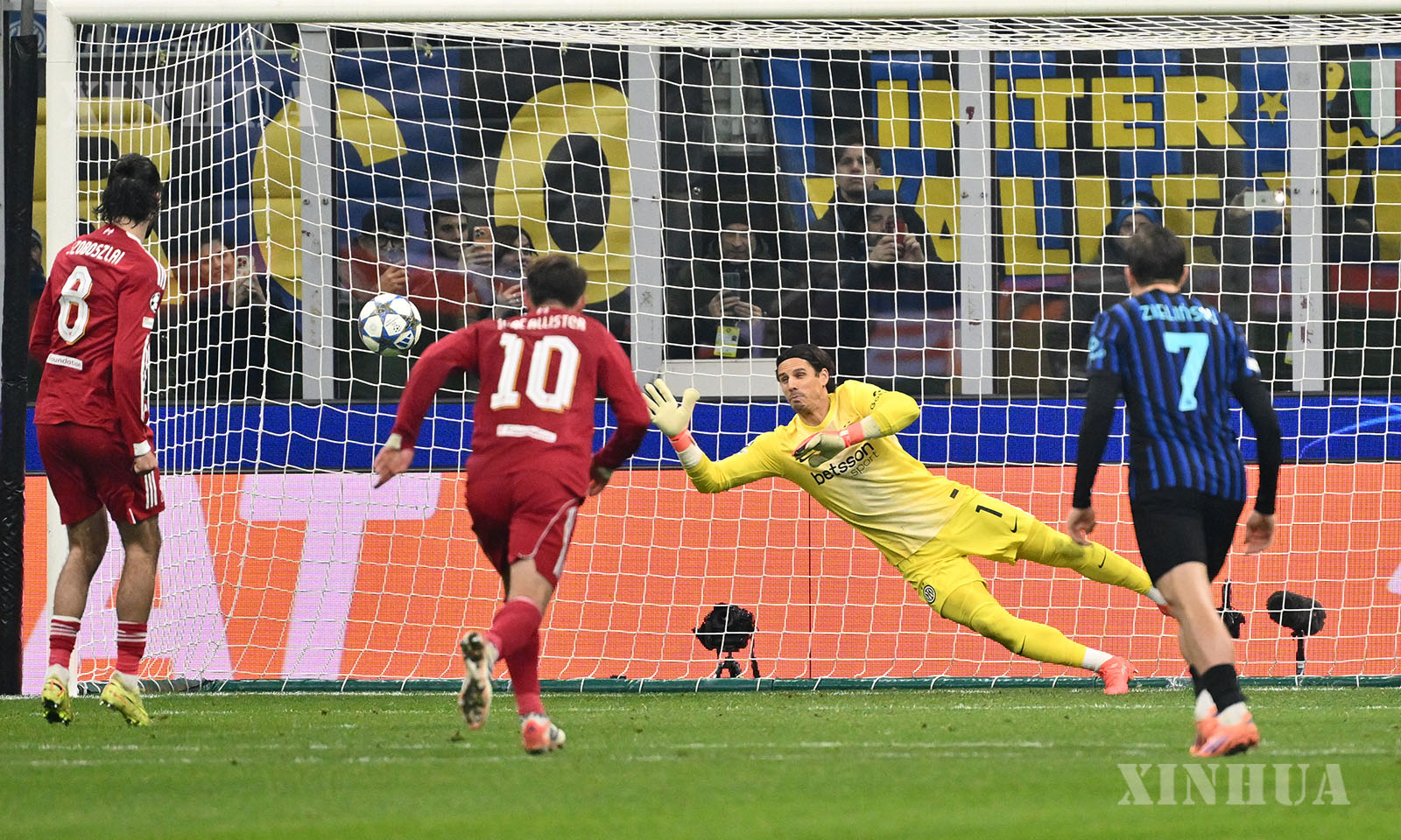 အီတလီနိုင်ငံ မီလန်မြို့တွင် ၂၀၂၅ ခုနှစ် ဒီဇင်ဘာ ၉ ရက်က အင်တာမီလန်နှင့် လီဗာပူးလ်အသင်းတို့ ယှဉ်ပြိုင်ကစားခဲ့သည့် ယူအီးအက်ဖ်အေ ချန်ပီယံလိဂ်ဘောလုံးပွဲစဉ်၌ လီဗာပူးလ်အသင်းမှ ဒေါမနစ် ဆိုဘော့ဇ်လိုင် (ဝဲ-ပထမ) ပင်နယ်တီမှတစ်ဆင့် ဂိုးသွင်းယူနေစဉ် (ဆင်ဟွာ)