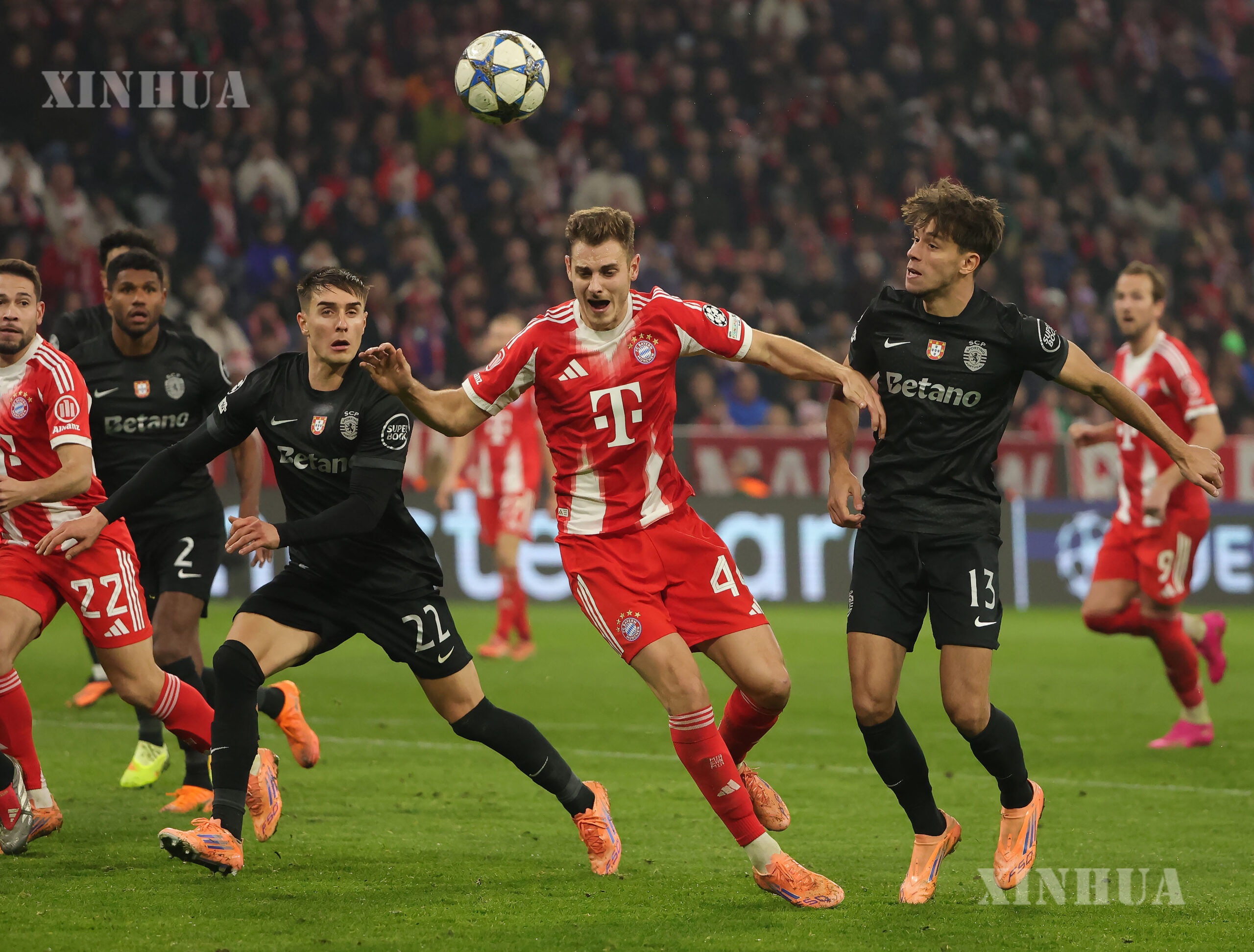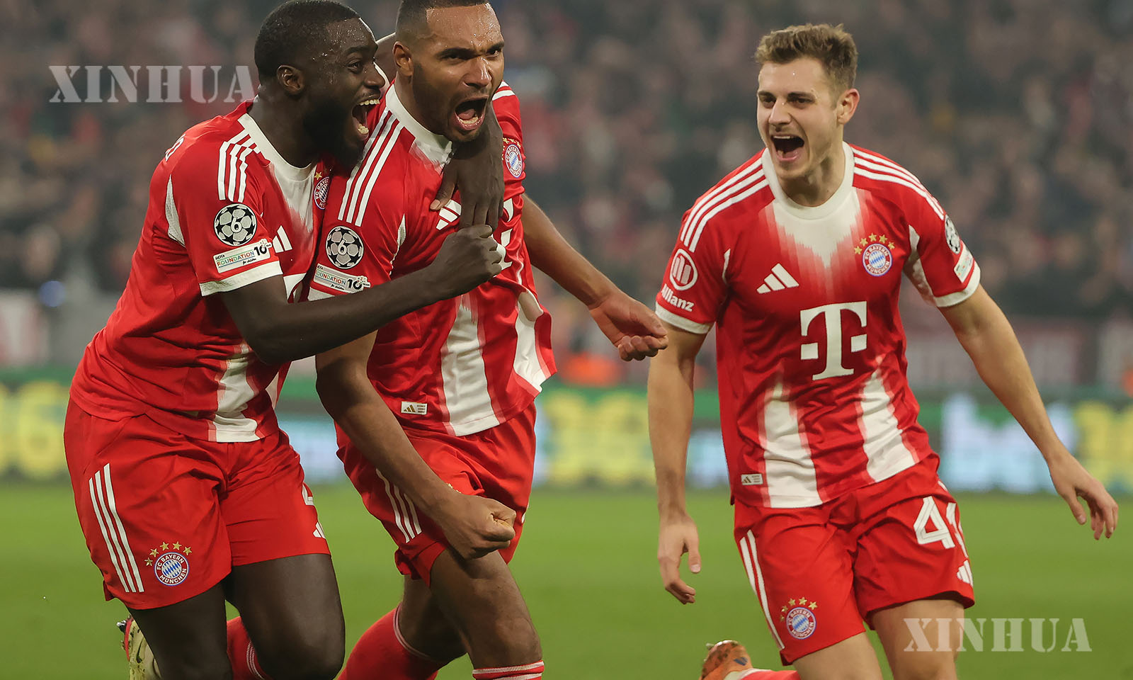 ဂျာမနီနိုင်ငံ မြူးနစ်မြို့တွင် ၂၀၂၅ ခုနှစ် ဒီဇင်ဘာ ၉ ရက်က ဘိုင်ယန်မြူးနစ်နှင့် စပို့တင်းလစ္စဘွန်းအသင်းတို့ ယှဉ်ပြိုင်ကစားခဲ့သည့် ယူအီးအက်ဖ်အေ ချန်ပီယံလိဂ်ဘောလုံးပွဲစဉ်၌ ဘိုင်ယန်မြူးနစ်ကစားသမား ဂျိုနသန်တား (အလယ်) ဂိုးသွင်းပြီးနောက် အသင်းဖော်များနှင့်အတူ အောင်ပွဲခံနေစဉ် (ဆင်ဟွာ)