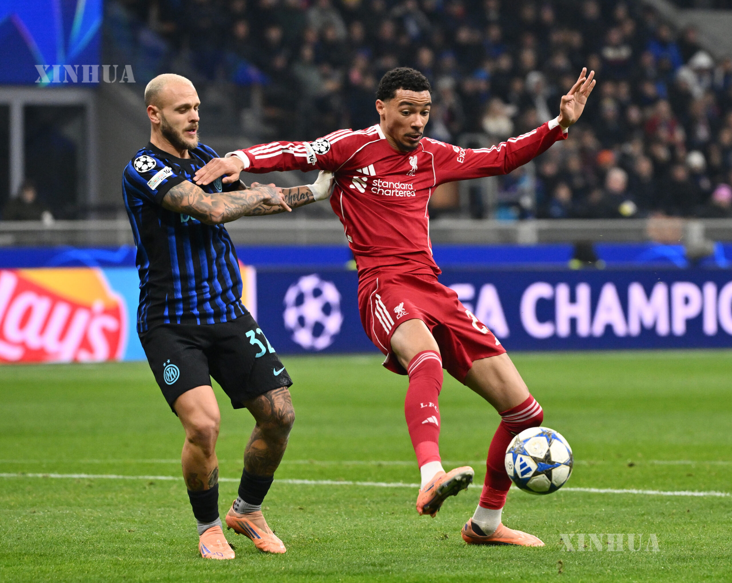 Liverpool’s Dominik Szoboszlai (1st L) scores penalty goal during the UEFA Champions League between Inter Milan and Liverpool in Milan, Italy, Dec. 9, 2025. (Photo by Alberto Lingria/Xinhua)