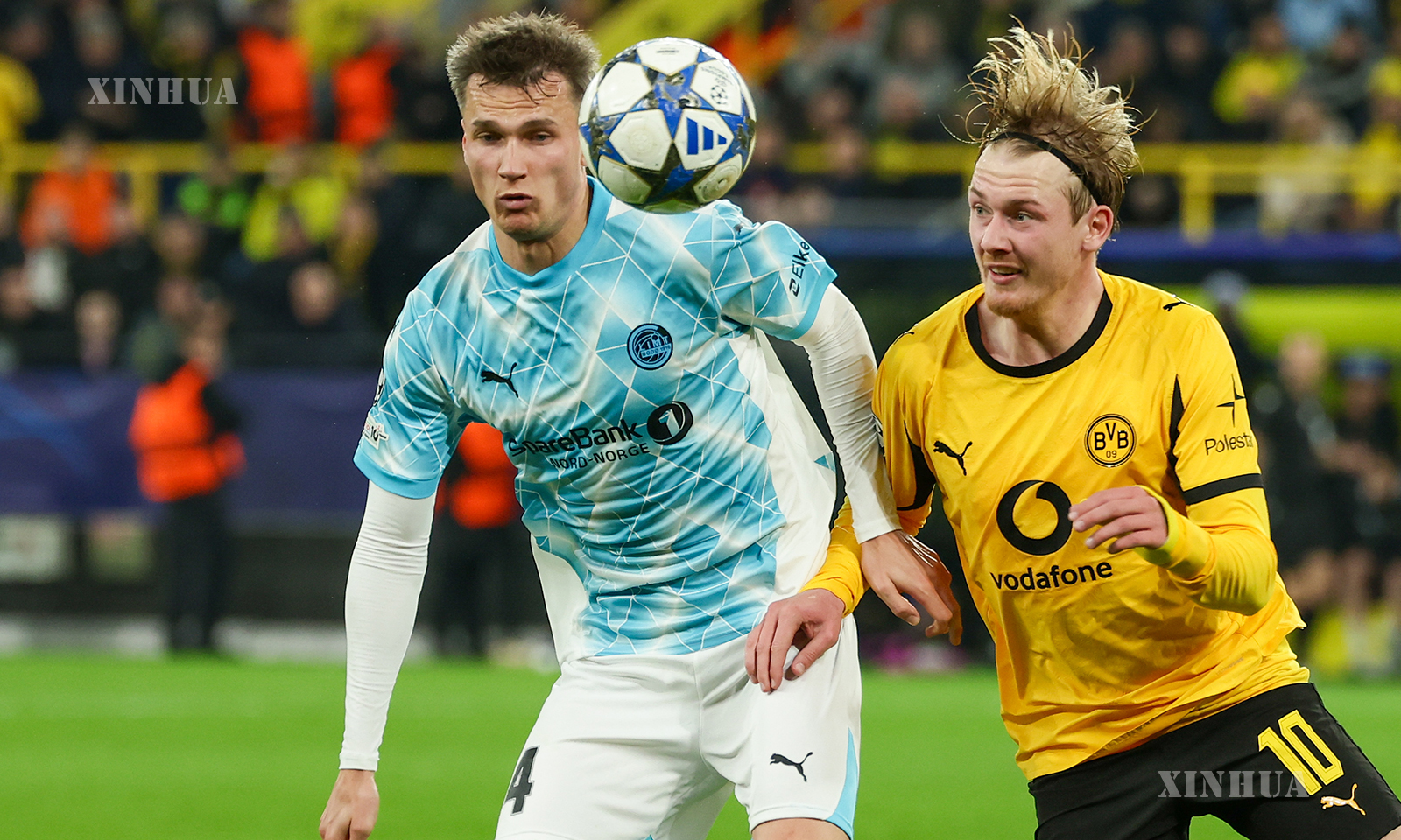 ဂျာမနီနိုင်ငံ ဒေ့ါမွန်မြို့တွင် ၂၀၂၅ ခုနှစ် ဒီဇင်ဘာ ၁၀ ရက်က ဒေ့ါမွန်နှင့် ဘိုဒို/ဂလင့်အသင်းတို့ ယှဉ်ပြိုင်ကစားခဲ့သည့် ယူအီးအက်ဖ်အေ ချန်ပီယံလိဂ်ဘောလုံးပွဲစဉ်၌ ဒေ့ါမွန်အသင်းမှ ဂျူလီယန် ဘရန့်ထ် (ယာ) နှင့် ဘိုဒို/ဂလင့်အသင်းမှ Odin Bjortuft တို့ ဘောလုံးယှဉ်လုနေပုံကို တွေ့ရစဉ် (ဆင်ဟွာ)