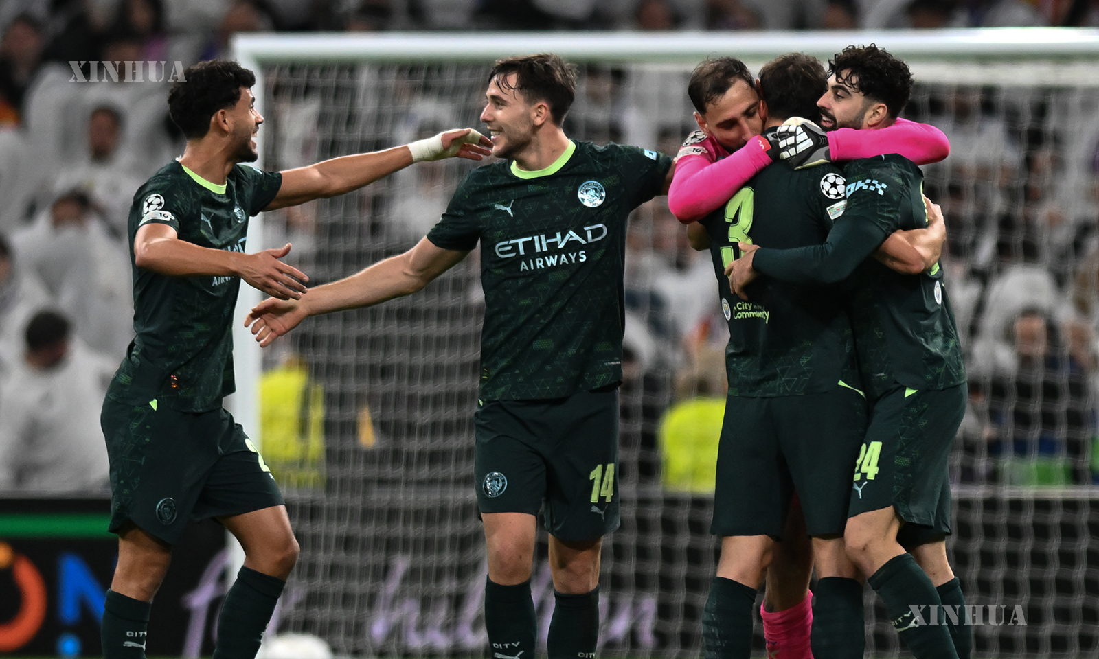 Players of Manchester City celebrate scoring during the UEFA Champions League football match between Real Madrid and Manchester City in Madrid, Spain, Dec. 10, 2025. (Xinhua/Cheng Min)