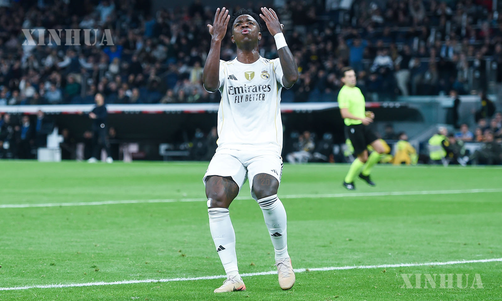 စပိန်နိုင်ငံ မက်ဒရစ်မြို့ရှိ ဆန်တီယာဂိုဘာနေဗျူး အားကစားကွင်း၌ ၂၀၂၅ ခုနှစ် ဒီဇင်ဘာ ၇ ရက်က ရီးရဲလ်မက်ဒရစ်နှင့် ဆယ်လ်တာဗီဂိုအသင်းတို့ ယှဉ်ပြိုင်ကစားခဲ့သည့် လာလီဂါဘောလုံးပွဲစဉ်တွင် ရီးရဲလ်မက်ဒရစ်အသင်းမှ ဗင်နီစီယက်စ် ဂျူနီယာ၏ တုံ့ပြန်မှုအား တွေ့ရစဉ် (ဆင်ဟွာ)