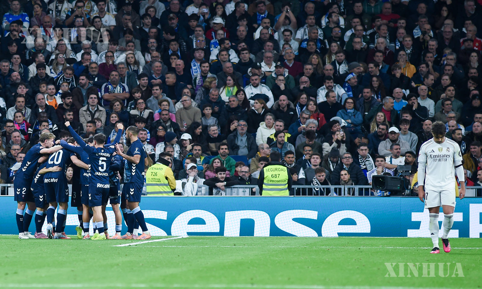 စပိန်နိုင်ငံ မက်ဒရစ်မြို့ရှိ ဆန်တီယာဂိုဘာနေဗျူး အားကစားကွင်း၌ ၂၀၂၅ ခုနှစ် ဒီဇင်ဘာ ၇ ရက်က ရီးရဲလ်မက်ဒရစ်နှင့် ဆယ်လ်တာဗီဂိုအသင်းတို့ ယှဉ်ပြိုင်ကစားခဲ့သည့် လာလီဂါဘောလုံးပွဲစဉ်တွင် ဆယ်လ်တာဗီဂို ကစားသမားများ ဂိုးသွင်းပြီးနောက် အောင်ပွဲခံနေစဉ် (ဆင်ဟွာ)