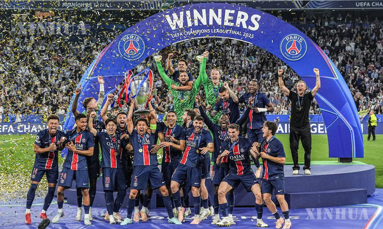 Players and head coach Luis Enrique (1st R) of Paris Saint-Germain celebrate winning the UEFA Champions League in Munich, Germany, May 31, 2025. (Xinhua/Peng Ziyang)