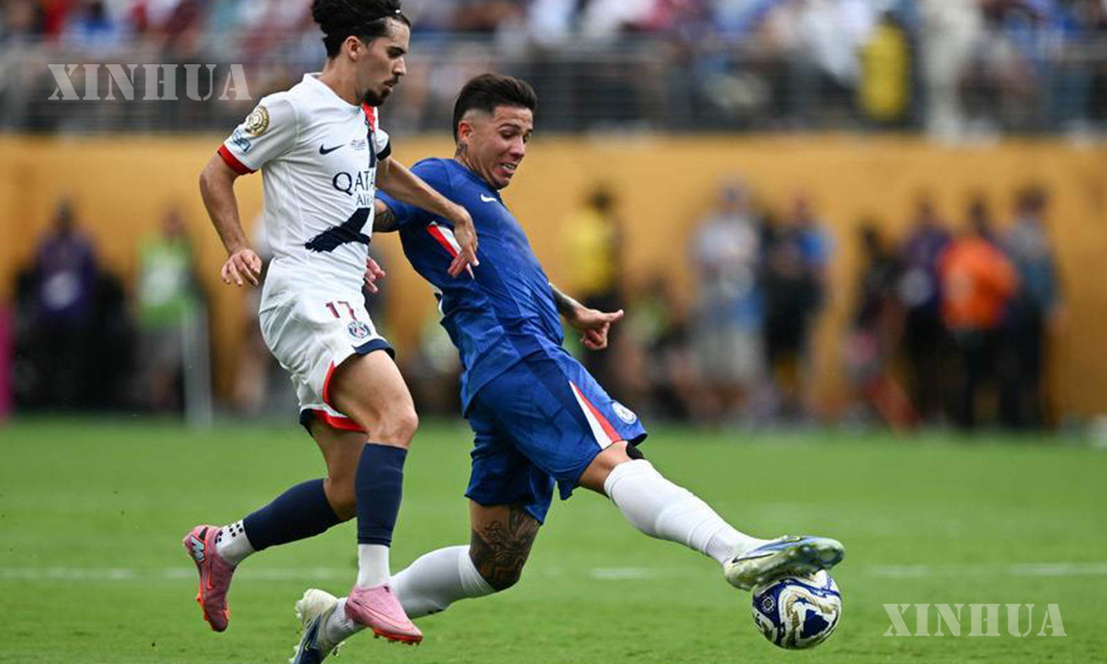 Enzo Fernandez (R) of Chelsea vies with Vitinha of Paris Saint-Germain during the FIFA Club World Cup 2025 final at the MetLife Stadium, New Jersey, the United States, July 13, 2025. (Xinhua/Li Rui)