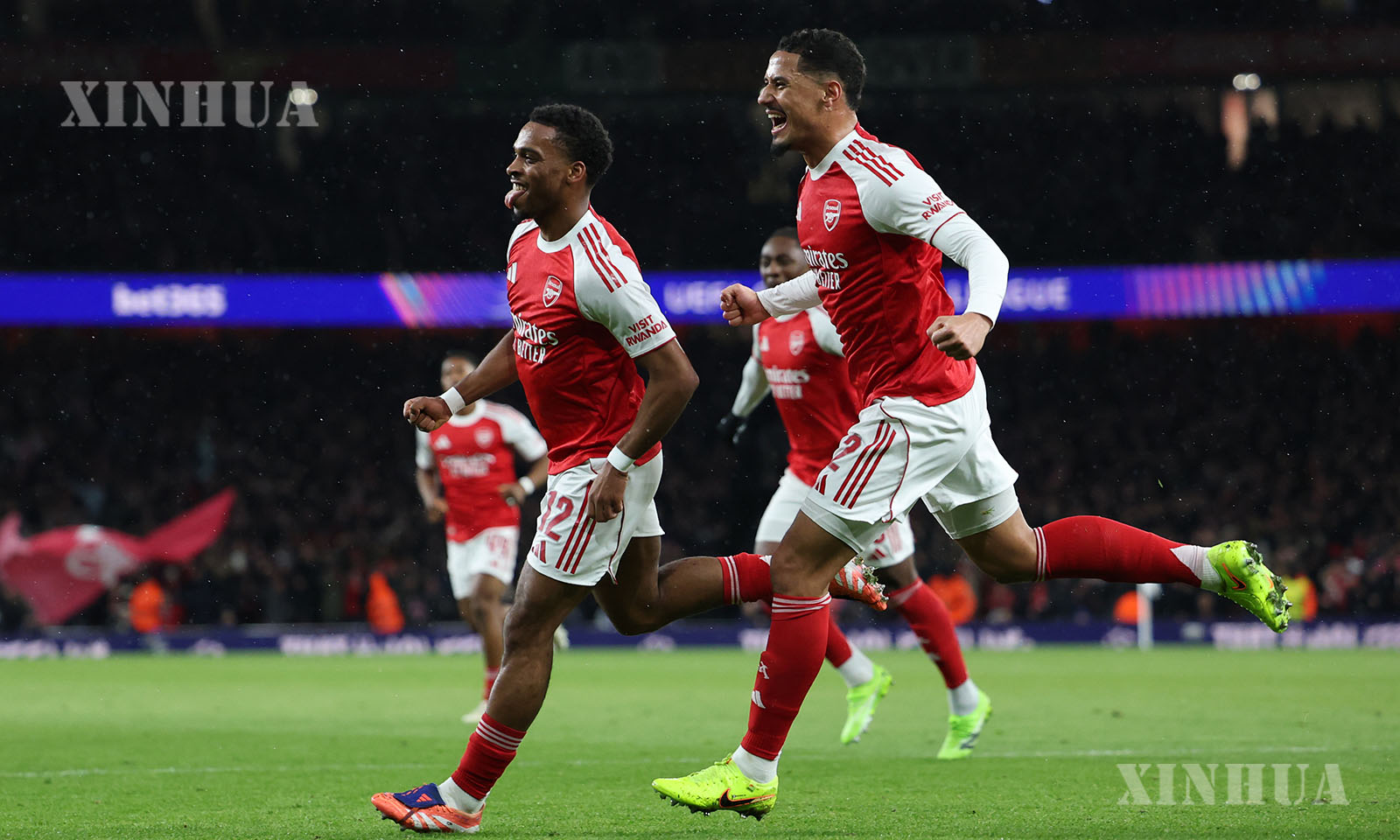 Arsenal’s players celebrates scoring during the UEFA Champions League football match between Arsenal and Bayern Munich in London, Britain, Nov. 26, 2025. (Xinhua/Li Ying)